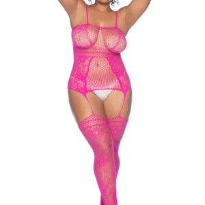 Verleihen Sie Ihren Kurven mit diesem eleganten, rosafarbenen, floralen Netz-Overall in großen Größen, der über integrierte Strapse und passende Strümpfe verfügt, einen Hauch von Raffinesse. Dieses verführerische Design kombiniert eine perfekte Passform mit einem formenden Effekt für einen unwiderstehlichen Look.