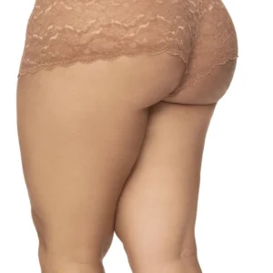 Taupefarbener Shorty, große Größe, aus Spitze. Schöne taupefarbene Spitze, sehr weich auf der Haut, aus der Mapalé-Kollektion. Zusammensetzung 90% Polyamid 10% Elasthan. Pflegehinweis: Handwäsche, keine Bleichmittel verwenden, nicht im Trockner trocknen.