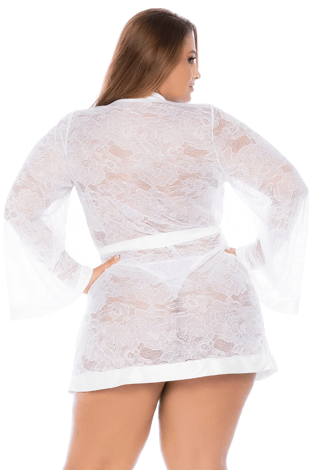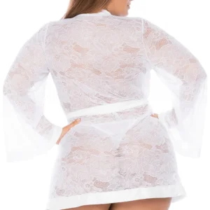 + Free ShippingGroßer weißer transparenter Spitzenmorgenmantel mit Bindegürtel in der Taille und ausgestellten langen Ärmeln von Ihrem Anbieter Mapalé, Großhandel für sexy Dessous.