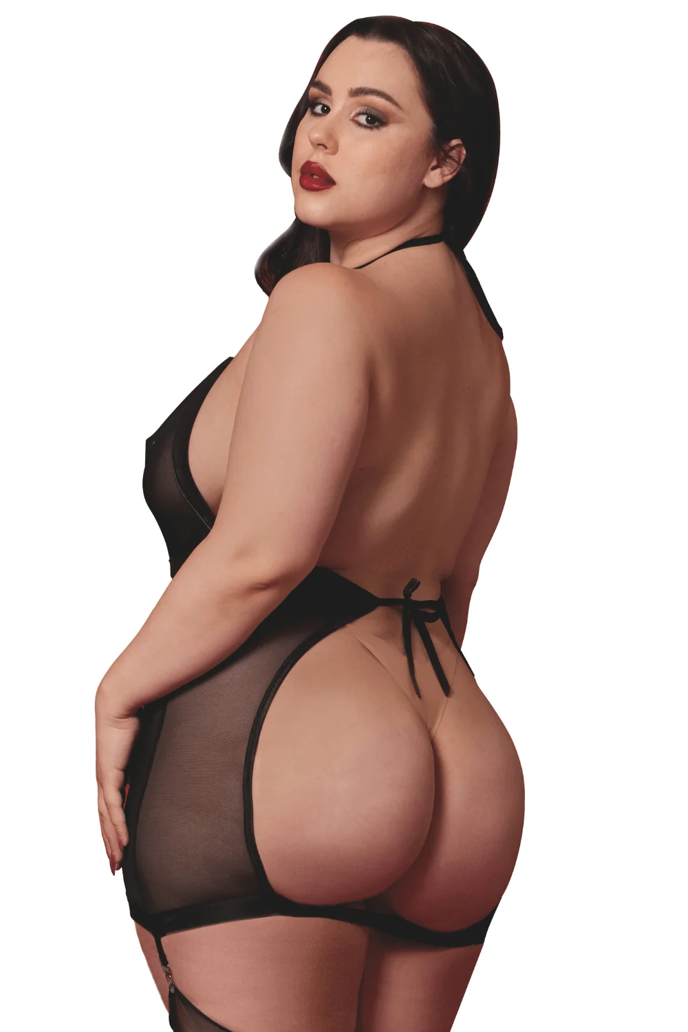 Große Größe Negligé, schwarz transparent mit integrierten Strumpfhaltern und abnehmbarem Peitsche. Bindet im Rücken und am Hals mit Knoten. String, Strümpfe und Nippel nicht enthalten. Materialien: 95% Polyester 5% Spandex