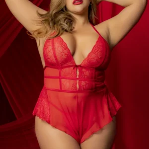 Roter Body, große Größe, im Babydoll-Stil mit Verschlüssen am Rücken, Schnürung um den Hals und passendem String inklusive. Zusammensetzung: 94% Nylon und 6% Elasthan