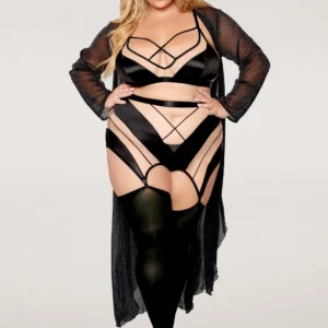 Dessous-Set, große Größe, modern, avantgardistisch im „sexy Domina“-Stil, bestehend aus einem BH, Strumpfhalterrock und passendem String; BH mit Schaumstoff-Cups und feinem transparentem Netz. Verstellbare Träger und Hakenverschluss am Rücken. Strumpfhalterrock mit undurchsichtigen Streifen und feinem transparentem Netz und passendem String. Strümpfe nicht enthalten. Ref. 0277 separat erhältlich. Zusammensetzung: BH: Mikrofaser: 95% Polyester, 5% Elasthan; Netz: 80% Nylon, 20% Elasthan; Schaumstoff-Cup: 100% Polyester; Strumpfhalterrock: Mikrofaser: 95% Polyester, 5% Elasthan; Netz: 80% Nylon, 20% Elasthan; String: Mikrofaser: 95% Polyester, 5% Elasthan. Pflegehinweis: Separat von Hand in kaltem Wasser waschen, nicht im Trockner trocknen.