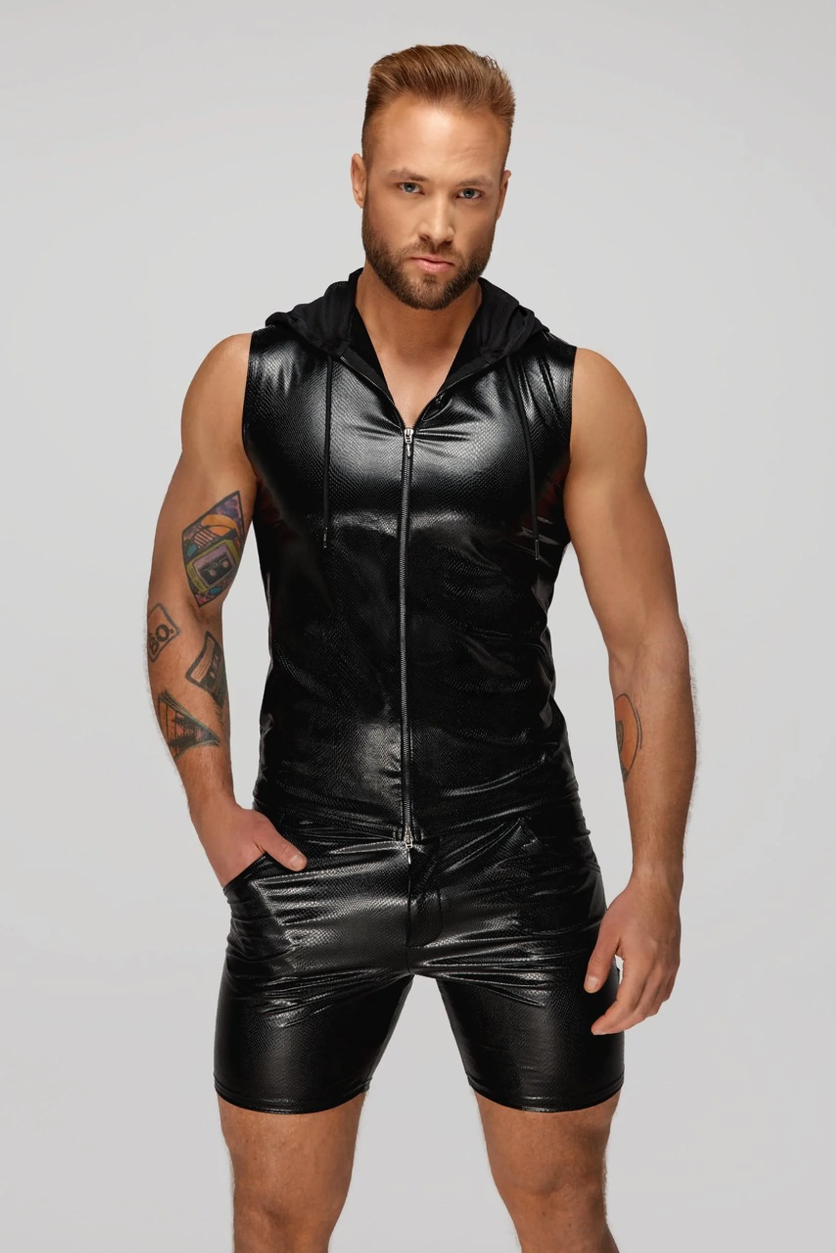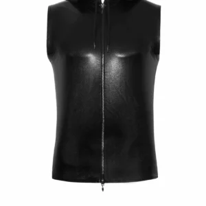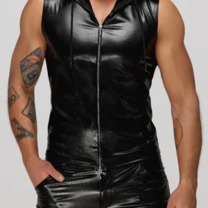 Elastique imprimé de type wetlookPowernet élastiqueFermeture éclairTous les hommes sont des monstres dans ce haut sans manches super sexy. Fabriqué dans un look serpent très tendance, il est doté d’une capuche transparente.Tissu principal : 90% polyester 10% élasthanne enduit de polimère