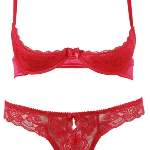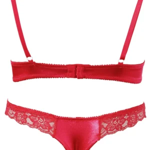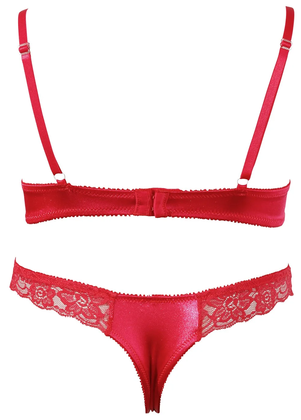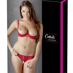 Glühend rot! Dieses Spitzen-Set, bestehend aus einem Bügel-Halb-BH, um Ihre Brust zu enthüllen. Kleine Satinschleife. Verstellbare Träger. Ein brasilianischer String, der im Schritt offen ist und mit kleinen Schleifen verziert ist. Halb-BH mit Bügeln und offener String aus der Cottelli-Kollektion. Zusammensetzung: 85% Polyester, 15% Elasthan. Ohne Strümpfe.