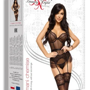 Nuisette extrêmement originale et sexy réalisée à la manière d’un corset. Fabriquée en matériau translucide – maille fine. Le bas est fini avec une basque accrocheuse – un volant en dentelle noire et argentée. Les bonnets sont renforcés par des armatures. Réglage taille arrière. String inclus.Mis dans l’élégant emballage avec la photo présentant le produit, marqué l’hologramme du logo Beauty Night Fashion. Sac-pochette de rangement ou de lessive inclus. Taille : S/M et L/XL Taille S/M : (Poitrine : 81-91 cm, B-C, Taille : 56-71 cm, Hanche : 85-97 cm) Taille L/XL : (Poitrine : 91-107 cm, C-D, Taille : 71-91 cm, Hanche : 97-112 cm) Matériau : 45 % polyester, 45 % polyamide, 10 % élasthanne