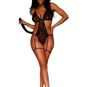 Katzenkostüm bestehend aus einem Spitzen-Body mit Strumpfhalter und abnehmbarem Schwanz hinten, inklusive Halsband, Haarreif und Spitzenmaske. Zusammensetzung: Garter Teddy: Spitze: 90% Nylon, 10% Spandex; Katzenzubehör: Maske/Ohren/Halsband/Schwanz: 100% Polyester: Ausschließlich Dekoration. Pflegehinweis: Von Hand in kaltem Wasser waschen, kein Bleichmittel verwenden, nicht im Trockner trocknen.
