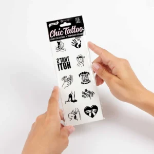 Vous aimez les tatouages ??mais avez-vous peur de les regretter à l?avenir? Voilà! Nous avons la solution. Chic Tattoo est une collection de tatouages ??temporaires que vous ne regretterez jamais. Utilisez-les comme et quand vous le souhaitez, pour les montrer lors de vos festivals préférés ou lors de soirées tant désirées. Ses designs attrayants sont idéaux pour flirter et séduire. Ou tout simplement pour passer un bon moment et emporter avec vous ces tatouages ??réindicatifs et suggestifs. Contenu: Comprend 10 tatouages ??temporaires. Kinky Collection Mode d’utilisation: La peau doit être complètement propre et sèche. Découpez le dessin désiré dans la feuille et retirez le papier transparent. Placez le tatouage face bas sur la peau. Frottez fermement le dos du tatouage avec un chiffon ou une éponge humide pendant 10 à 20 secondes et soulevez délicatement un coin du tatouage pour vérifier s’il se transfère bien. S’il a été transféré, décollez doucement le papier. Sinon, appuyez sur le papier et humidifiez-le à nouveau. Après avoir enlevé le papier, séchez le tatouage en tapotant. Si on le soigne bien, il durera plusieurs jours (3-7 jours). Utilisez de l’huile d’olive pour éliminer le tatouage.