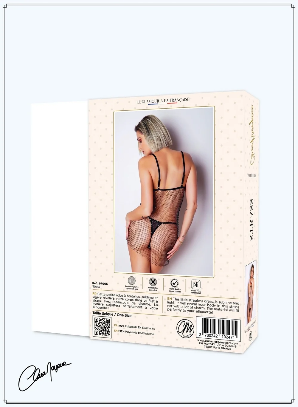 Sexy kleines Kleid aus der Strass Clara Morgane Kollektion, aus feinem Netz … atemberaubend durch seinen mit Strass besetzten Stoff. Extrem transparent, kleidet dieses Kleid leicht, wie eine zarte Berührung, Ihre Silhouette und betont Ihre Kurven. Das Netz fällt perfekt und passt sich Ihrer Silhouette ohne jeglichen Unkomfort an. Zusammensetzung: 92% Polyamid und 8% Elasthan