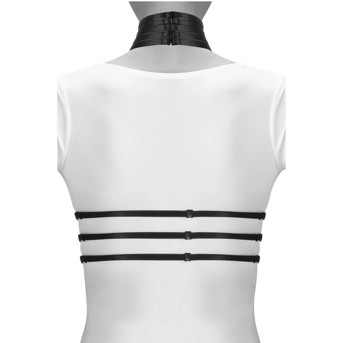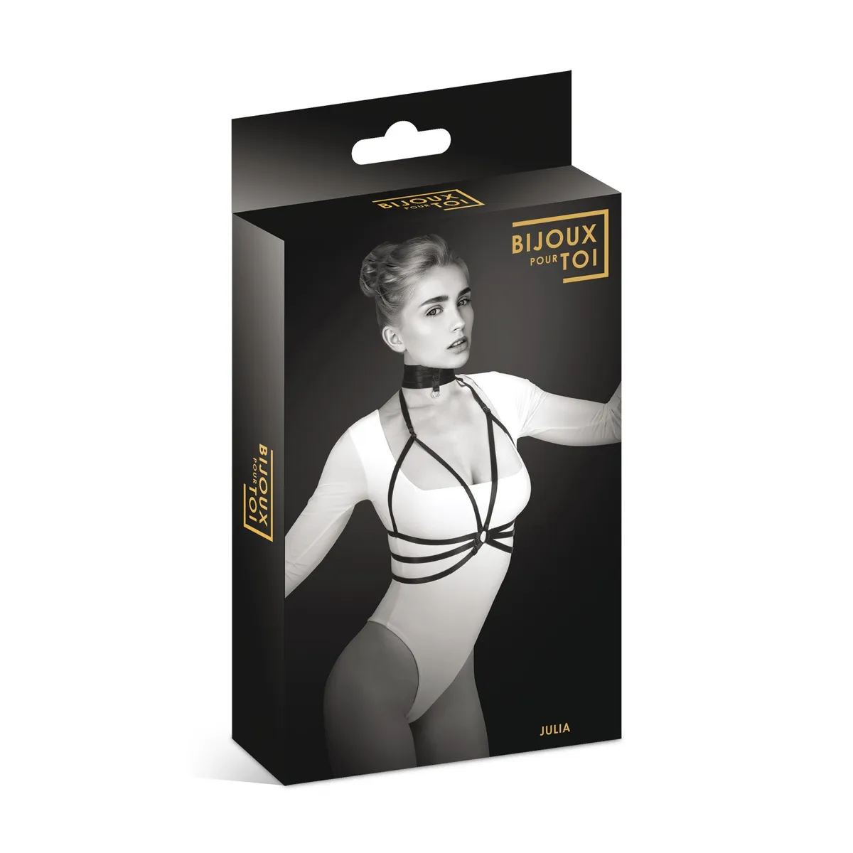 Körpergeschirr mit elastischen Verzierungen Julia, das nackt, über Dessous und sogar als Kleidungsschmuck getragen werden kann. Dieses schwarze Brustgeschirr Julia ist perfekt dehnbar und verfügt über mehrere Einstellmöglichkeiten. Polyester