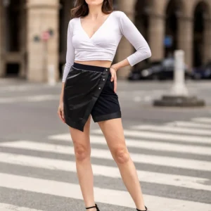 Kurzer Rock im Wickelstil aus schwarzem Kunstleder vorne mit Druckknopf, der auf den schwarzen elastischen Gürtel hochgeht. Die Rückseite besteht aus einem schwarzen elastischen Material, um Ihre Silhouette perfekt zu betonen. Materialien: 92% Polyester / 8% Elasthan