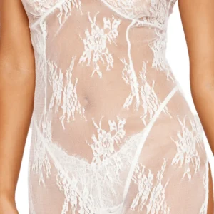 Langes weißes Negligé aus floraler Spitze, passender String – DG13667WHT
