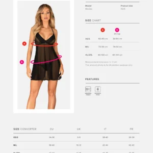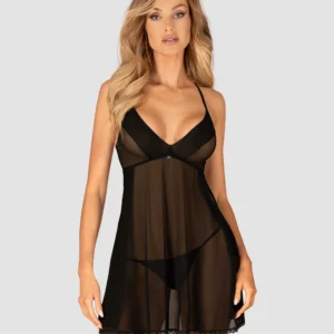 Latinesa babydoll & stringL?élégance peut-elle aller de pair avec un look sexy? Jetez un coup d??il à cette nuisette sensuelle et voyez par vous-même! Son tissu d?une délicatesse exquise enveloppera doucement votre peau, assurera le confort et vous fera sentir féminine comme jamais auparavant. Offrez-vous un petit plaisir coupable !Pour en savoir plus :- string et babydoll en noir- ajustement parfait possible grâce à la fixation en plusieurs étapes et aux sangles réglables- détail floral ? attire l?attention- pendentif brillant ? un ajout intéressant- tissu léger ? assure le confort de port (94 % polyamide, 6 % élasthanne)