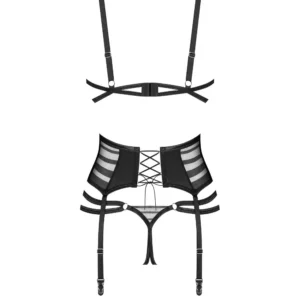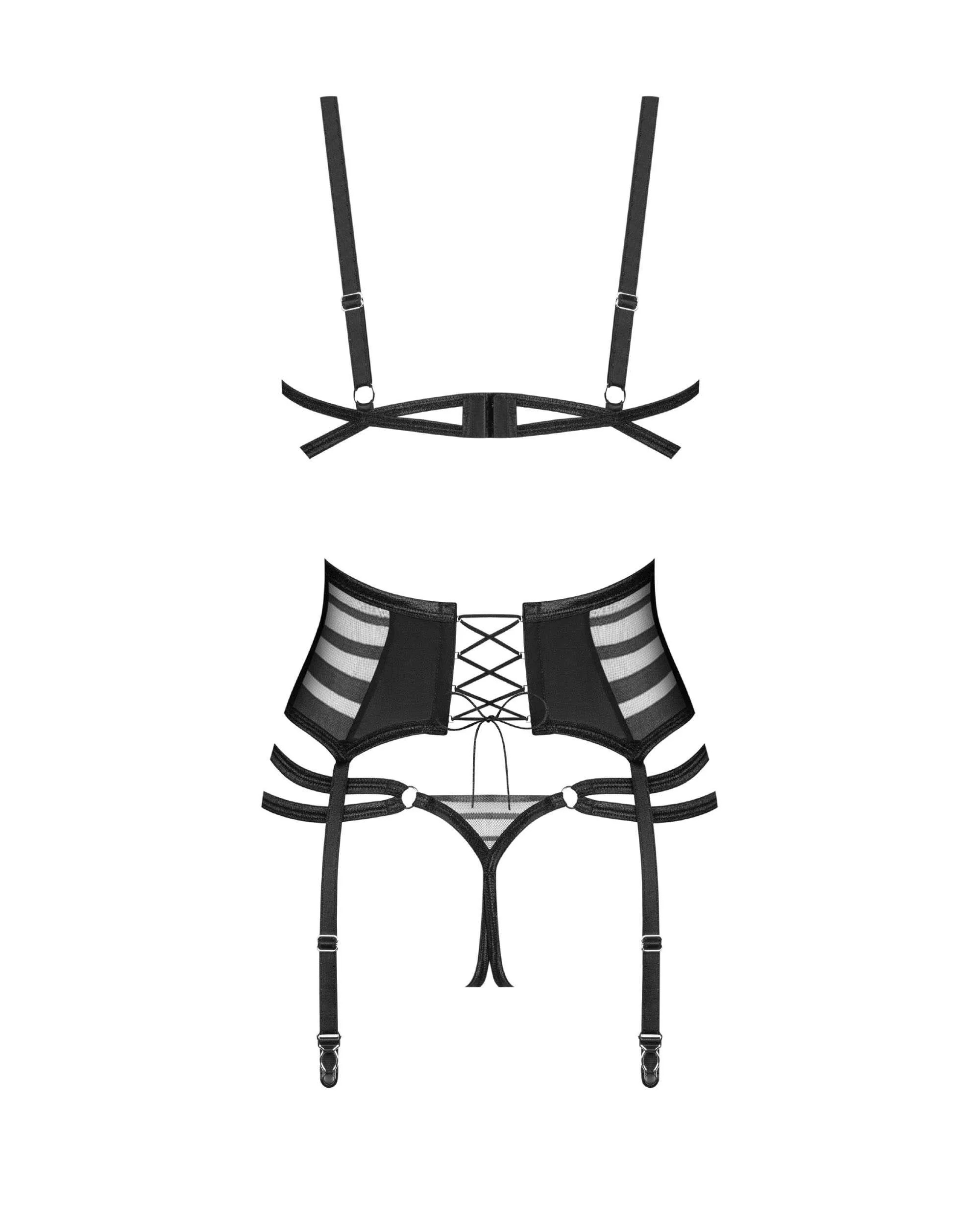 Lune Bellis ensemble ouvert 3 pièces   Une élégance provocante avec un soupçon de gaieté. Voici le set de lingerie ouverte 3 pièces Lune Bellis, avec des rayures transparentes pour une allure captivante. Fabriqué à partir de tissus de qualité supérieure, y compris le tissu tissé lisse et maille élastique,Il comprend : un soutien-gorge avec des bonnets ovales pour une coupe flatteuse, un porte-jarretelles large avec bretelles intégrées et un string ouvert pour une finition audacieuse. ? soutien-gorge, string et porte-jarretelles noirs? tissu doux au toucher et maille transparente? Bonnets à armatures et courroie de soutien? Ajustements pour un confort ultime? fermeture à lacets à l?arrière? 90 % polyamide, 10 % élasthanne? conçu dans l?UE? sans nickel