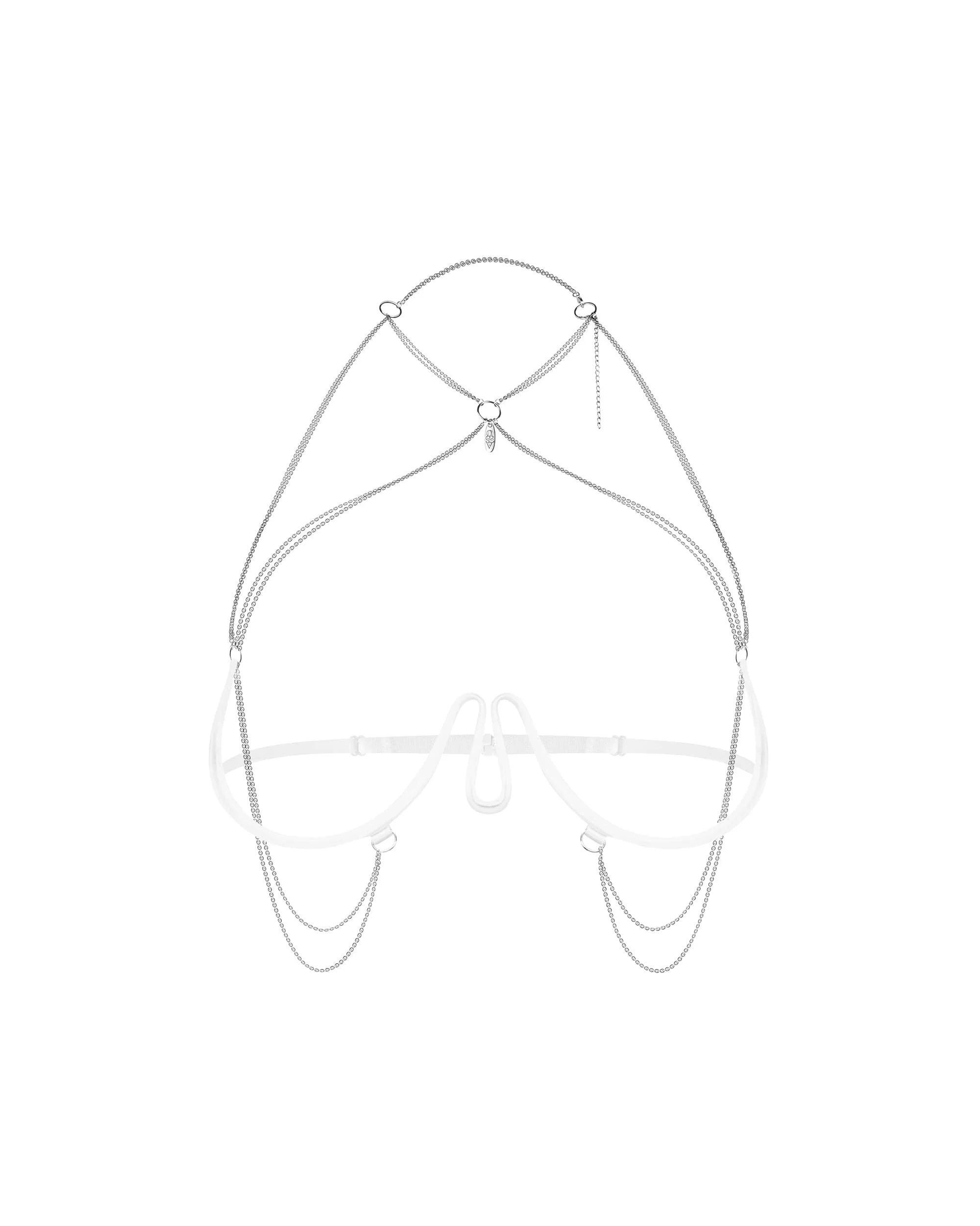 Lustique harnais soutien-gorge blancLustique  harnais soutien-gorge blanc est doté d?un sous-buste pour accentuer votre poitrine et mettre en valeur votre corps. Les chaînes en argent drapent les épaules et la taille, créant un effet de bijoux. Le design léger et la fermeture réglable à l?arrière garantissent le confort, tandis que le pendentif décoratif OSSV ajoute une touche finale unique.Conçu dans l?UE.Ne convient pas aux enfants de moins de 3 ans ?risque d?étouffement en raison des petites pièces détachables.Open design  Sous-buste désossé pour le soutien et la mise en formeFermeture à taille quadruple et fermoir simple au dos    Bretelles réglables au niveau des épaules, de la taille et du busteCollier réglableChaînes décoratives en argentSans nickelFait de matériaux de haute qualitéConçu dans l?UE. Ne convient pas aux enfants de moins de 3 ans ?risque d?étouffement en raison des petites pièces détachables.