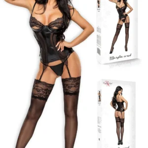 Ce corset Beauty Night est juste incroyable par son jeu de matière, de forme et de transparence. Le corset Marilyn est fabriqué dans un tissu brillant très élastique qui vient s’ajuster à votre corps. Pour une silhouette sculptée et un look sublimé, des armatures verticales ont été insérées dans la maille. Une superbe dentelle noire couvre délicatement les seins, alors que des baleines sont là pour les soutenir. Se ferme à l’arrière grâce à une rangée de petits crochets.Ensemble deux pièces bien qu’il vienne avec son porte-jarretelles intégré : corset et string.Composition : 88% Polyester, 12% Élasthanne
