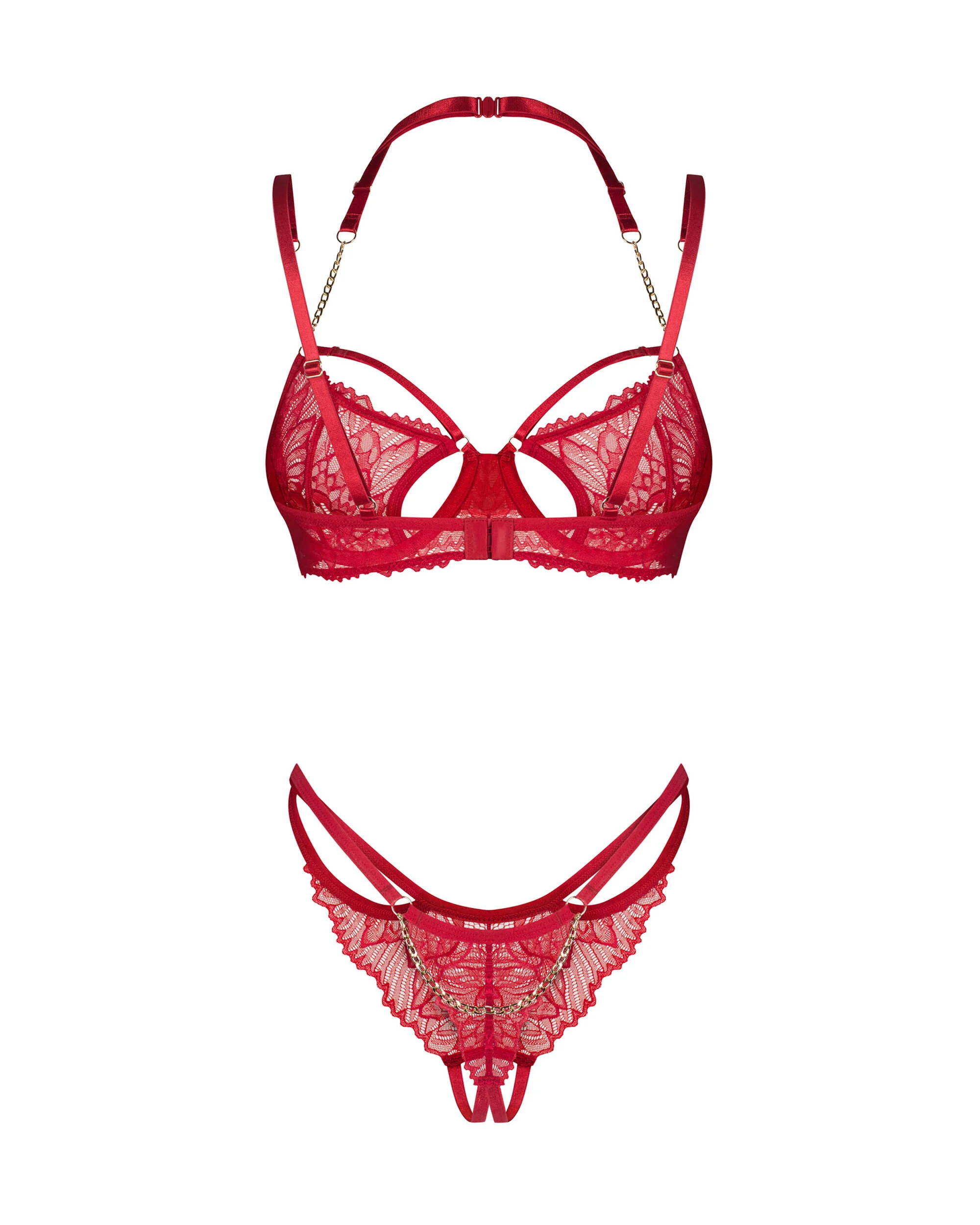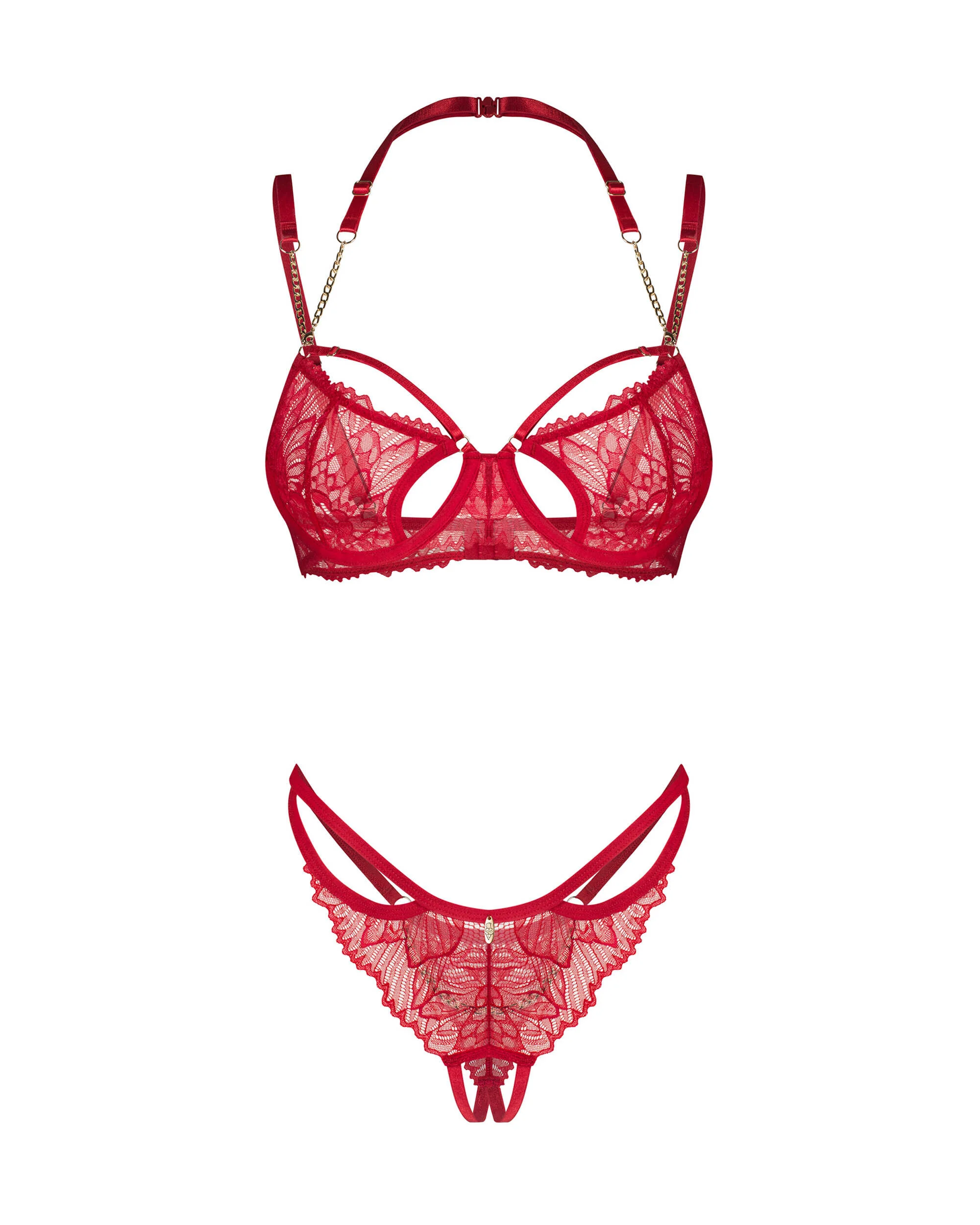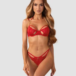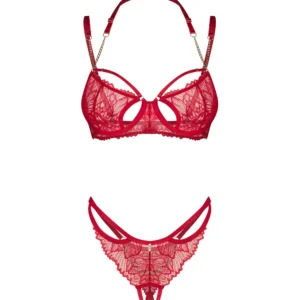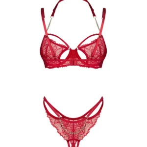Matildea 2-pcs ensemble ouvertEnsemble rouge, élégant en dentelle. Le soutien-gorge à armatures améliore la forme du buste, tandis que la courroie décorative avec une chaîne met en valeur l?encolure. String en dentelle ouvert avec un détail de chaîne à l?arrière complète le look saisissant. Des bretelles réglables et une fermeture arrière à plusieurs niveaux assurent un ajustement confortable.- set comprend soutien-gorge et string- soutien-gorge à armatures avec des découpes séduisantes- courroie de cou décorative avec détail de chaîne dorée- string en dentelle ouvert avec chaîne à l?arrière- bretelles réglables, sangle de cou et fermeture dos- 90% polyamide, 10% élasthanne- ce produit est sans nickelCe produit ne convient pas aux enfants de moins de 3 ans ? risque d?étouffement en raison des petites pièces qui peuvent être détachées du produit.