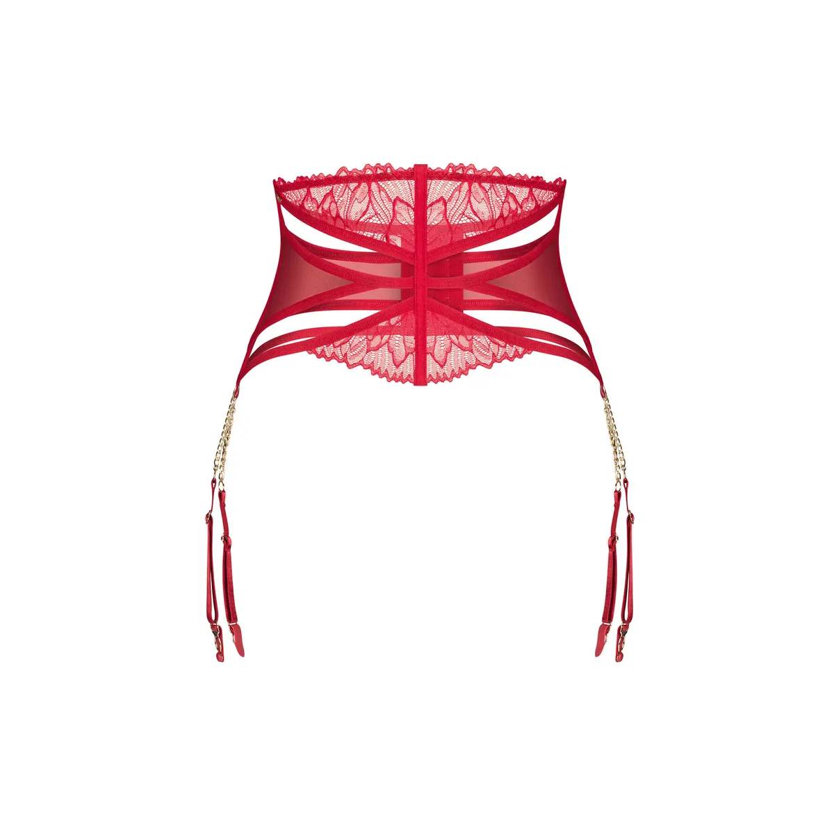 Matildea StrumpfhaltergürtelRoter Strumpfhaltergürtel aus Spitze und transparentem Netz. Ausgestattet mit vertikalen Stäben, die die Silhouette optisch formen, und einem auffälligen Riemendesign. Der mehrstufige Verschluss auf der Rückseite ermöglicht eine individuelle Anpassung. Die Strumpfhalter sind mit dekorativen goldenen Ketten verbunden, die für ein elegantes Finish sorgen.- moderner Stil und atemberaubendes Design- unterstützt durch vertikale Stäbe- goldene Ketten ergänzen die roten Stoffe wunderschön- mehrstufiger Rückenverschluss für totale Anpassungsfähigkeit- Zusammensetzung: 90% Polyamid, 10% Elasthan- nickelfreies und hypoallergenes ProduktDieses Produkt ist nicht für Kinder unter 3 Jahren geeignet – Erstickungsgefahr durch kleine Teile, die sich vom Produkt lösen können.