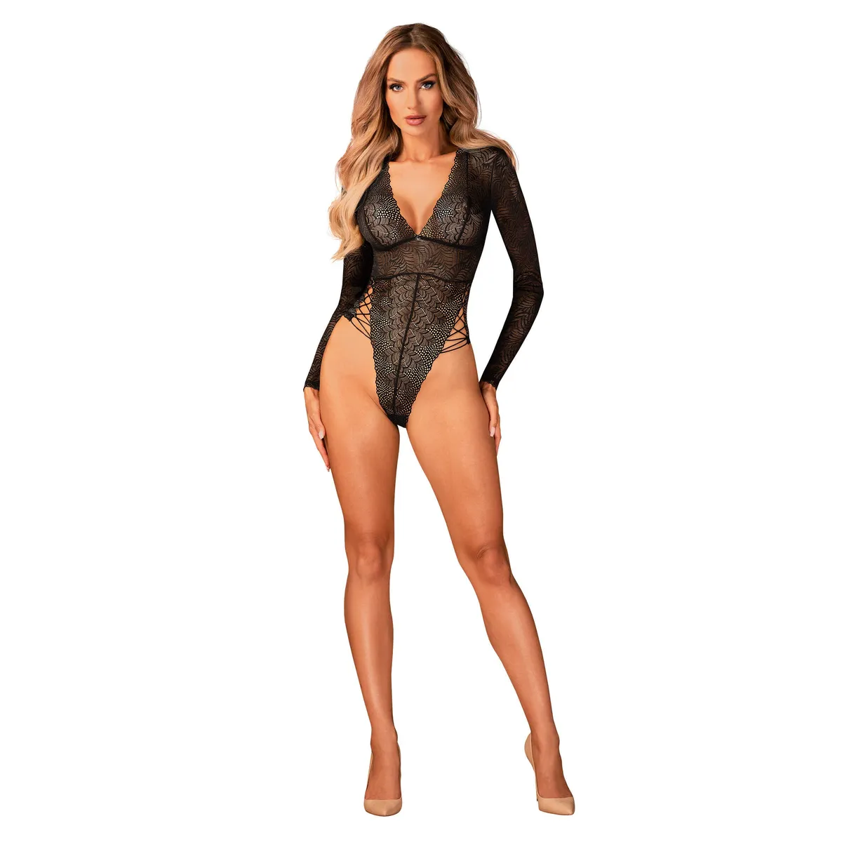 Teddy Merlys Mit diesem Teddy ist der Wow-Effekt garantiert! Ein außergewöhnliches, fast übernatürliches Spitzenmuster wird ihn davon abhalten, Sie aus den Augen zu lassen! Der sexy Schnitt und das Design dieses Teddys sind einfach fesselnd. Möchten Sie es selbst erleben? Entdecken Sie mehr Details: – Spitzen-Teddy mit Verschluss im Schritt – Schnürung an den Hüften – ein verlockendes Detail – eleganter Anhänger zwischen den Brüsten – verstellbarer und abnehmbarer Träger am Rücken – angenehmes Gewebe auf der Haut