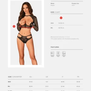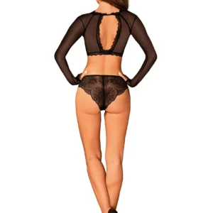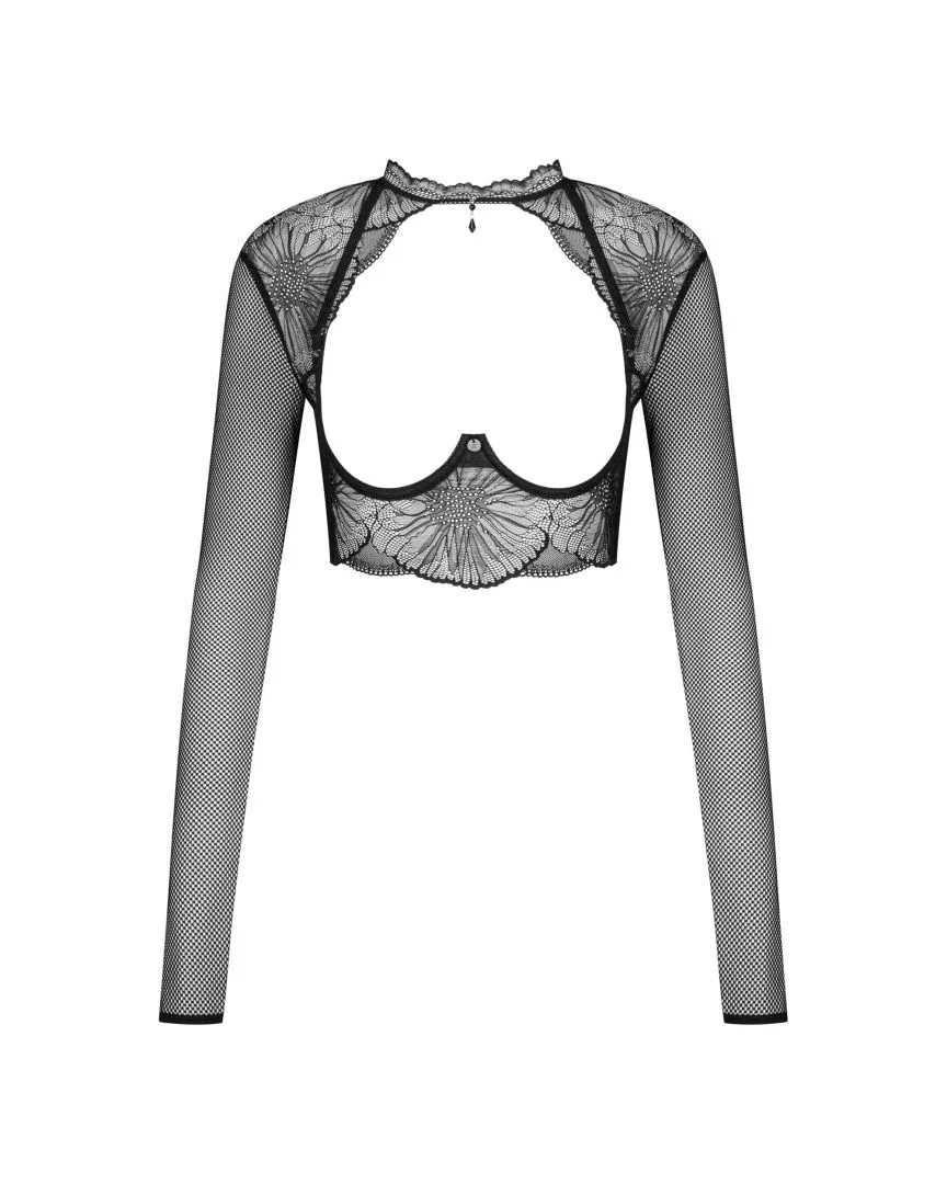 Vous ne pourriez pas donner à ce haut un seul coup d‘?il fugitif ! Manches longues, découpe au dos et bonnets ouverts !C’est le genre de lingerie qui vous attirera comme un papillon vers la flamme, si vous n’avez pas peur de jouer avec le feu ! Le haut combiné avec un soutien-gorge et une culotte de la même collection est un mélange chaud, sexy et explosif ! Vous laisserez-vous tenter ?Découvrez plus de détails :- Top Mibelia – bonnets ouverts et manches longues- découpe au dos – un design élégant- bonnets à armatures- bretelles réglables à l’avant – pour un confort de port supplémentaire- décoration de bijoux autour du cou – coquette et tentante- pendentif brillant entre les seins- fermeture réglable au dos- attache à l’arrière du cou- tissu délicat et agréable au toucher (85% polyamide, 15% élasthanne)