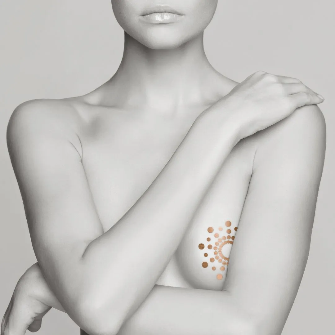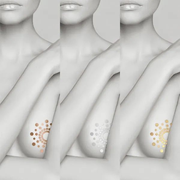 Adorables Nippelabdeckungen im Tattoo-Stil. Dieses Kit enthält 3 Sets (3×2) von Nippeln in verschiedenen Farben. Sie werden wie ein temporäres Metallic-Transfer angebracht.