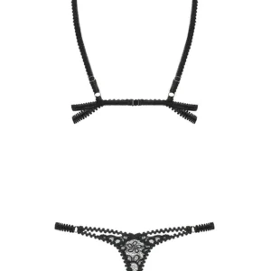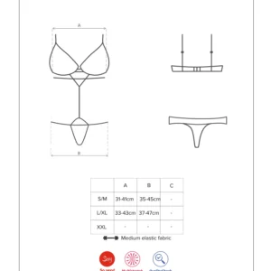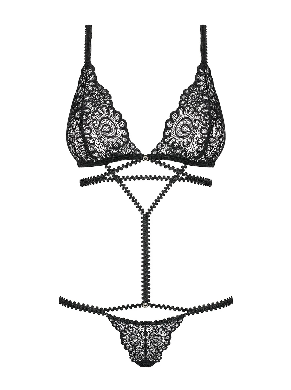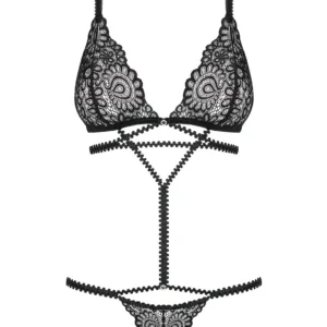 Un maximum d?effet pour ce body à la fois sensuel avec sa dentelle noire découpée et érotique avec son jeu de galons tendances et élastiques qui s?adapteront parfaitement à votre morphologie. Votre corps est magnifiquement dessiné et mis en valeur et il ne restera pas insensible, loin de là !Détails sexy :Body tendance et originalSoutien-gorge et string en dentelle élégante à bords découpésGalons élastiquesSoutien-gorge avec fixation au dosBretelles réglables – ajustement parfaitDétails anneaux brillantsdentelle et galons doux et élastiques – confort de portComposition : 90% polyamide, 10% élasthanne