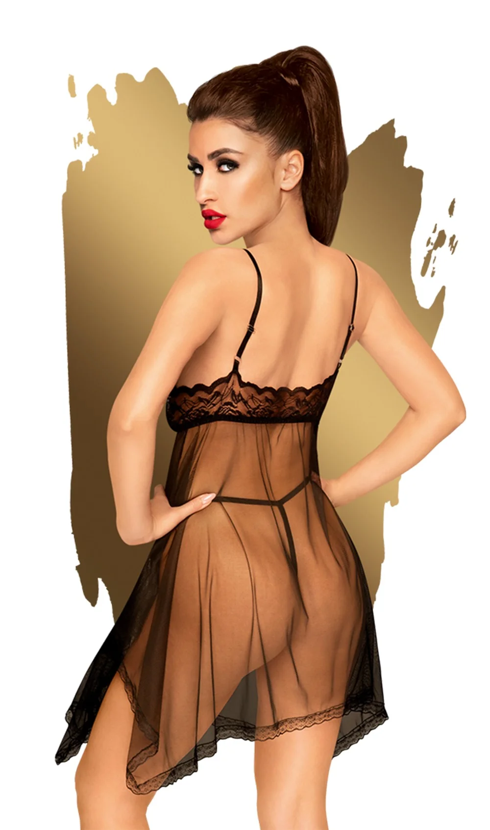 Entdecken Sie unsere Penthouse-Kollektion mit langem schwarzem Negligé „Naughty Doll“. Wunderschönes Negligé aus feinem schwarzen Netz und Spitze auf der Brust. Sinnvolle Stickerei am Dekolleté. Wunderschönes Design. Passender String inklusive. Zusammensetzung: 73% Polyester / 27% Elasthan