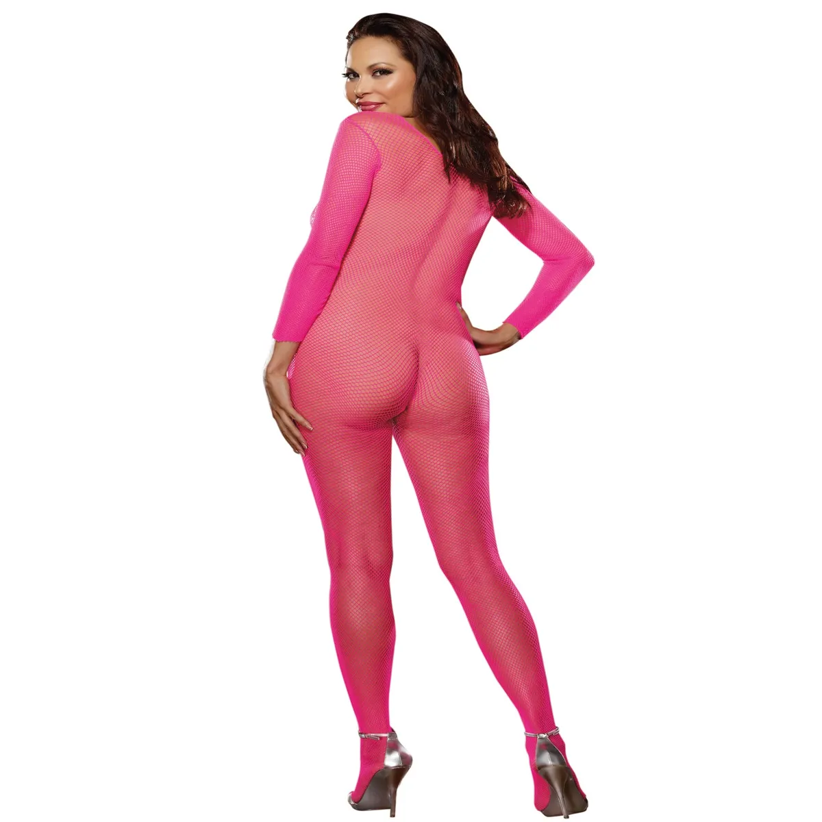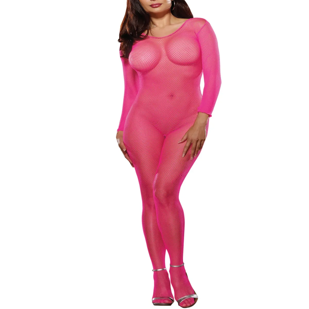 Wunderschöne fluoreszierend rosa Kombination, die sehr eng anliegt wie eine zweite Haut für starke Frauen. Dieser fluoreszierend rosa Netz-Bodystocking in großen Größen hat lange Ärmel. Ein kleines, sehr sexy Extra: Er ist im Schritt offen. 100% Nylon