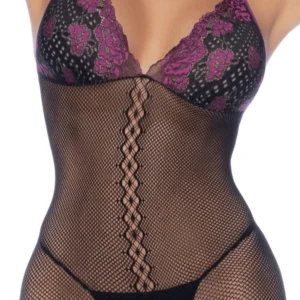Verleihen Sie Ihrer Silhouette mit diesem ultra-sexy schwarzen und violetten Netz-Body einen Hauch von Glamour. Die kontrastierenden floralen Spitzenkörbchen und der Neckholder betonen das Dekolleté, während der tief ausgeschnittene Rücken eine sinnliche Note hinzufügt. Das feine Netzdesign schmiegt sich elegant an die Kurven und sorgt für einen unwiderstehlichen Look.