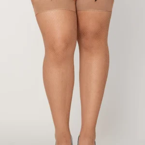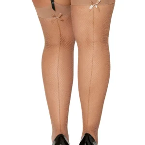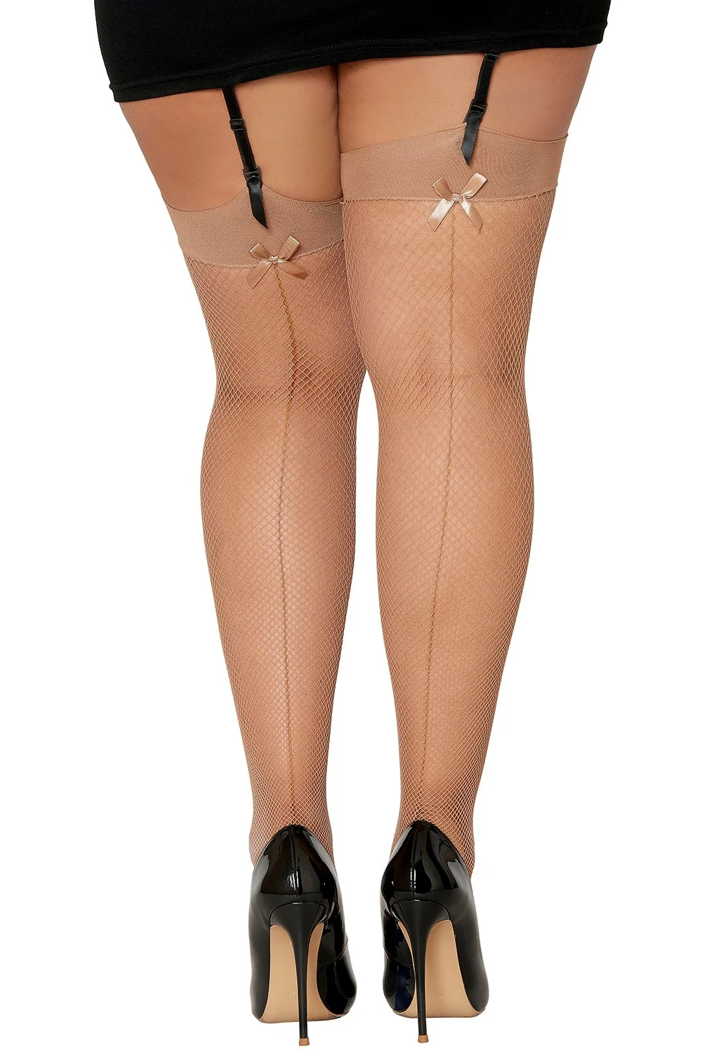 Feinstrümpfe in Netzoptik, hautfarben, große Größe, mit Satinschleife am Strumpfband und Naht auf der Rückseite. Zusammensetzung: Strümpfe: 90% Nylon, 10% Spandex / Pflegehinweis: Handwäsche in kaltem Wasser, nicht im Trockner trocknen