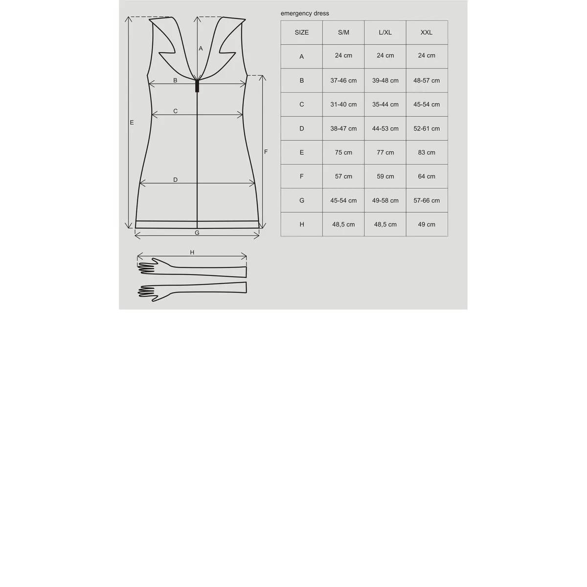 Das Notfallkrankenschwester-Kleid ist für Frauen gemacht, die den Mut und die Fantasie haben, ihre Fantasie auszuleben. Dieses Set umfasst das Kleid, einen String, die Krankenschwesterhaube, die Handschuhe und das Stethoskop. Das Kleid hat einen Ausschnitt unter einem wunderschönen und großen Kragen. Es wird mit einem Reißverschluss an der Vorderseite geschlossen. Die langen weißen Handschuhe sind aus einem elastischen Material gefertigt. Zusammensetzung: 90% Polyamid, 10% Spandex