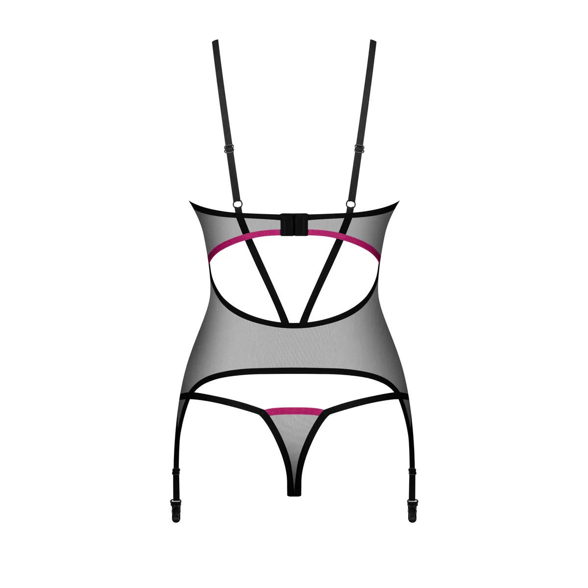 Novenes Korsett und StringVeredeln Sie Ihre intimen Momente mit diesem geschmackvollen Set, das eine perfekte Ergänzung für ein romantisches Rendezvous ist. Das Korsett und der String, aus subtil transparentem Stoff gefertigt, präsentieren ein modernes Design, das durch rosa Akzente und nicht abnehmbare Strumpfhalter hervorgehoben wird. ? schwarzes Korsett und String ? transparenter Stoff ? Bügel-Cups ? elastische Träger in purpur ? verstellbare Schulter- und nicht abnehmbare Strumpfhalter ? elegante und glänzende Dekoration mit schwarzen Zirkonen ? 94 % Polyamid, 6 % Elasthan ? entworfen in der EU ? enthält kein Nickel