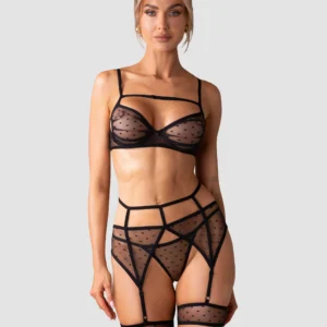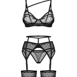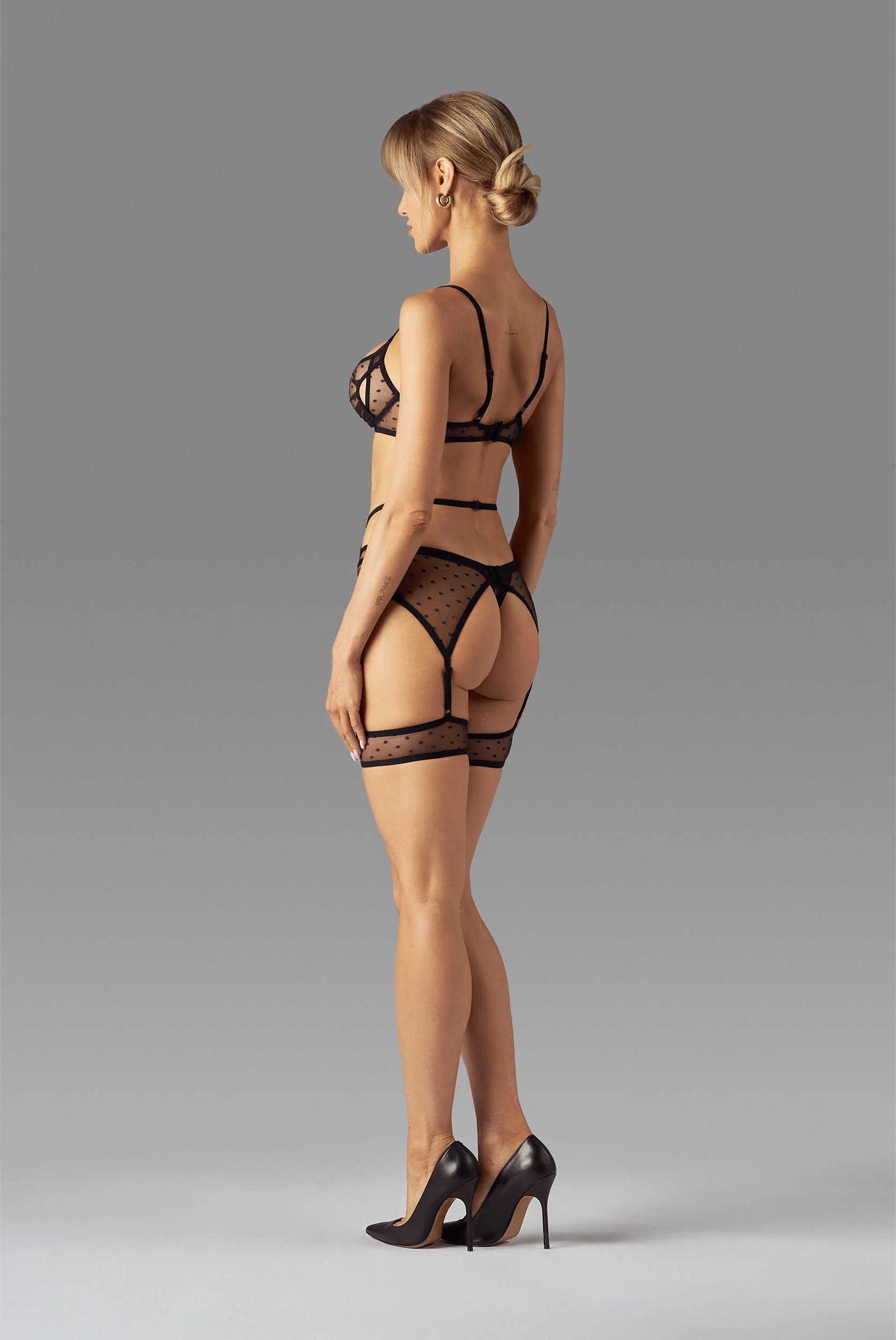 Nuites Ensemble 3 pièces   Cet ensemble de lingerie en trois pièces allie sophistication et confort. Confectionné dans un tissu extensible doux de qualité supérieure avec un motif à pois ludique, il comprend une bralette à armatures, un string classique et un porte-jarretelles polyvalent. Bretelles réglables et fermeture arrière multi-crochet sécurisée pour un ajustement parfait en toute occasion.. Ensemble à pois ? string, porte-jarretelles et bralette- tissus élastiques haut de gamme- Bonnets à armatures avec une sangle- Porte-jarretelles et bretelles réglables- Fermeture arrière multi-crochet pour plus de sécurité- Matière : 85% polyamide, 15% élasthanne- Conçu dans l?UE