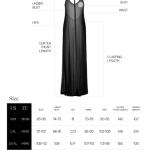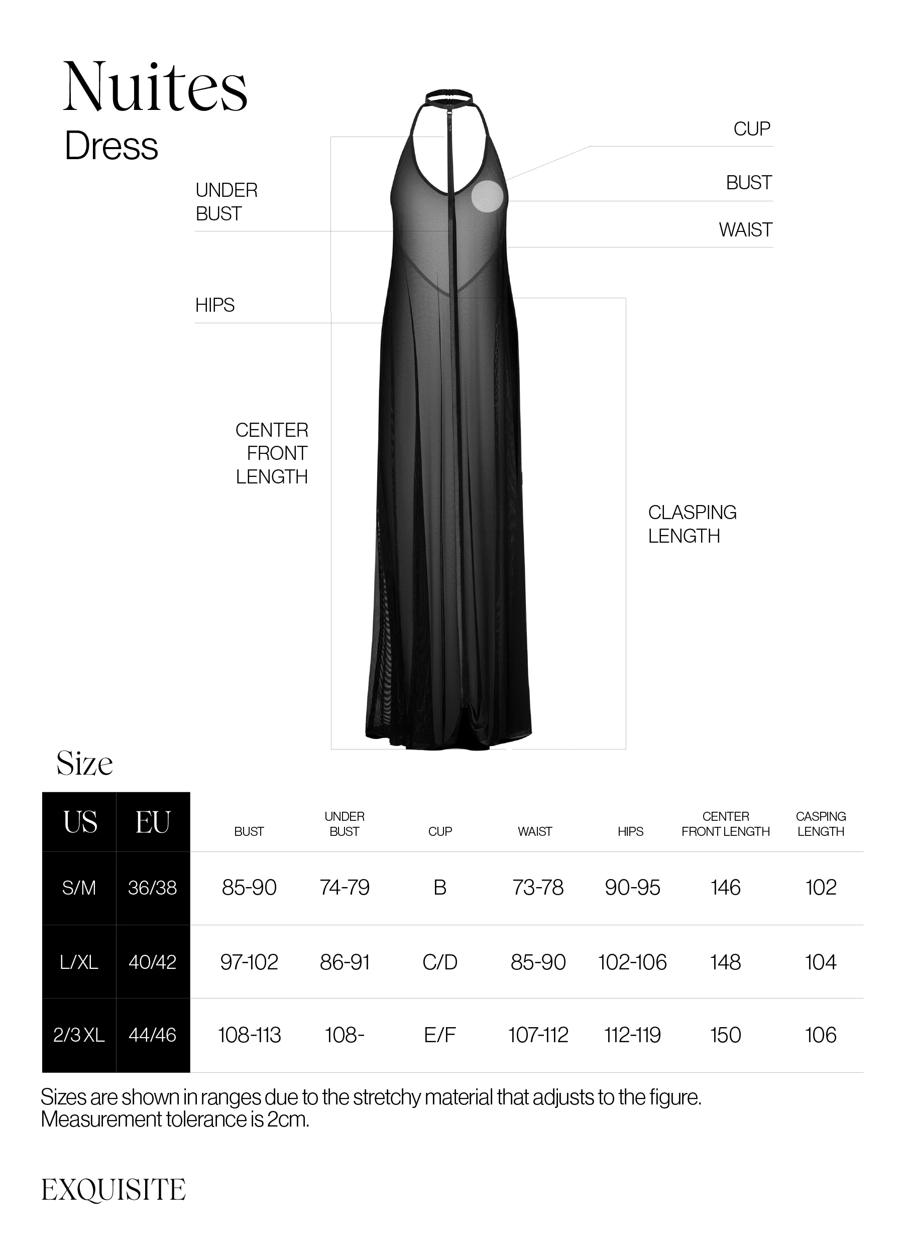 Robe longue Nuites Élevez votre glamour avec la robe longue noire gracieusement séduisante de Nuites. L?audacieux décolleté triangulaire, élégamment fixé au cou, attire tous les regards par son design impeccable. Confectionnée dans un tissu ultra-léger et transparent, cette robe exhale le luxe sans effort. Une finition brute donne une ambiance de pointe, complétée par le choker réglable et le ruban élégant qui créent un équilibre parfait entre l?audace et l?élégance. Principales caractéristiques :- Robe longue noire élégante à l?esthétique minimaliste et moderne- Coupe profonde spectaculaire pour une silhouette saisissante- Encolure triangulaire encadrée avec bordure élastique _ Construction à panneaux flatteuses qui s?écoule avec grâce ? Coutures décoratives verticales pour allonger et rehausser la silhouette_ Tissu doux et tactile qui se sent luxueux contre la peau? Collier de serrage réglable et sangle à double réglage pour un confort personnalisé) Détails noirs subtils et percutants pour une finition polie_ Conçu et fabriqué avec soin dans l?UE? 94 % polyamide, 6 % élasthanne pour plus de souplesse et de durabilité