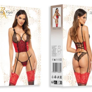Ensemble sexy composé d?un corset court et d?une culotte. Le corset court et la culotte sont en satin et guipure.Les bonnets semi-ouverts et translucides du corset ont été renforcés avec des armatures. Le corset a un ajustement au dos sous la forme de laçage et de sangles permettant un ajustement individuel.Culotte confortable qui expose magnifiquement les fesses.Dans un emballage élégant avec une photo montrant le produit. Taille : S/M et L/XLTaille S/M : (Seins : 81-91 cm, B-C, Taille : 56-71 cm, Hanche : 85-97 cm)Taille L/XL : (Seins : 91-107 cm, C-D, Taille : 71-91 cm, Hanche : 97-112 cm)Matières : 97% polyester, 3% élasthanne