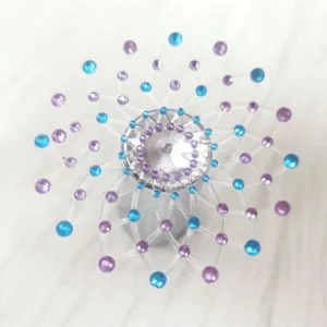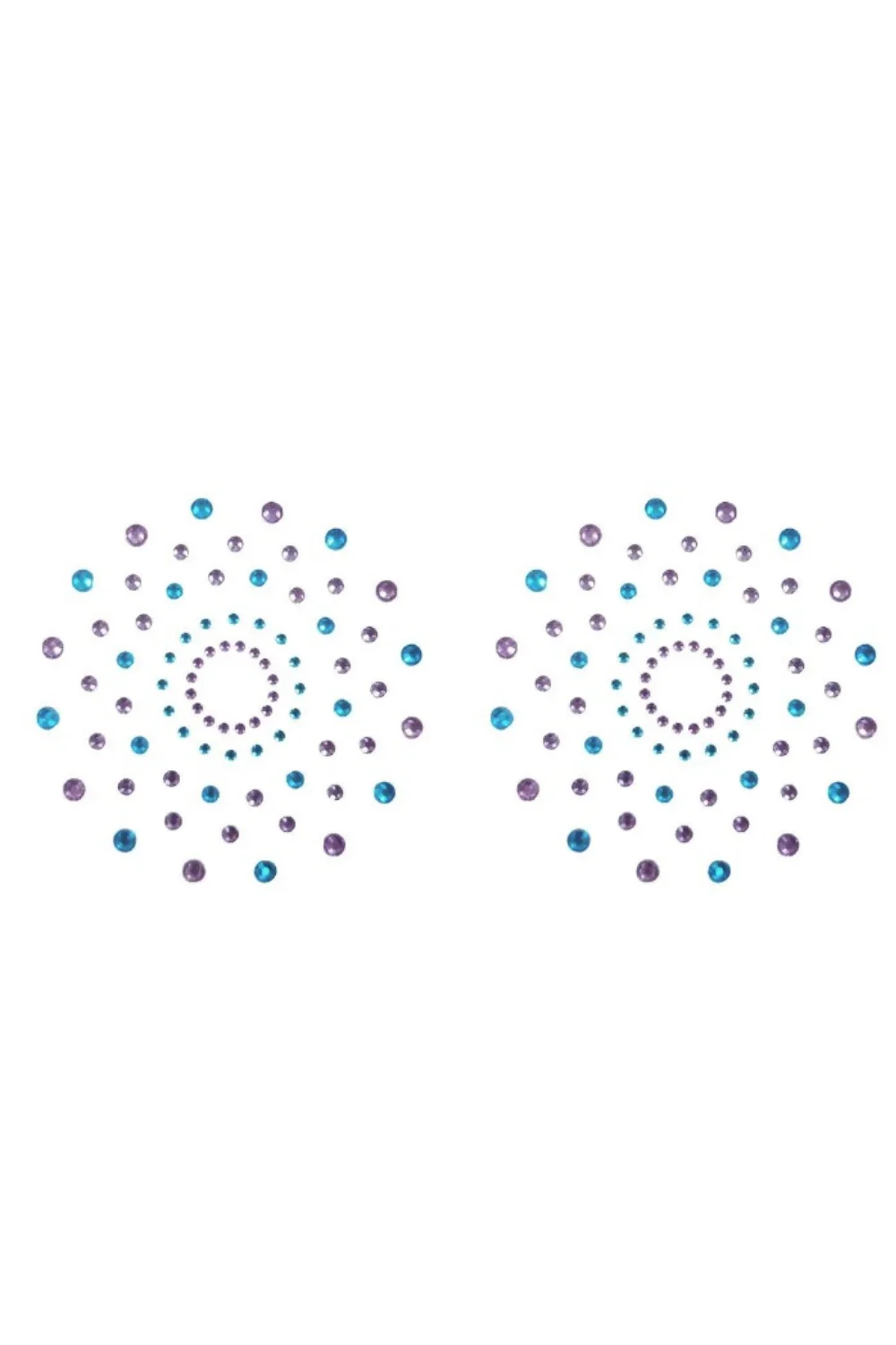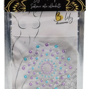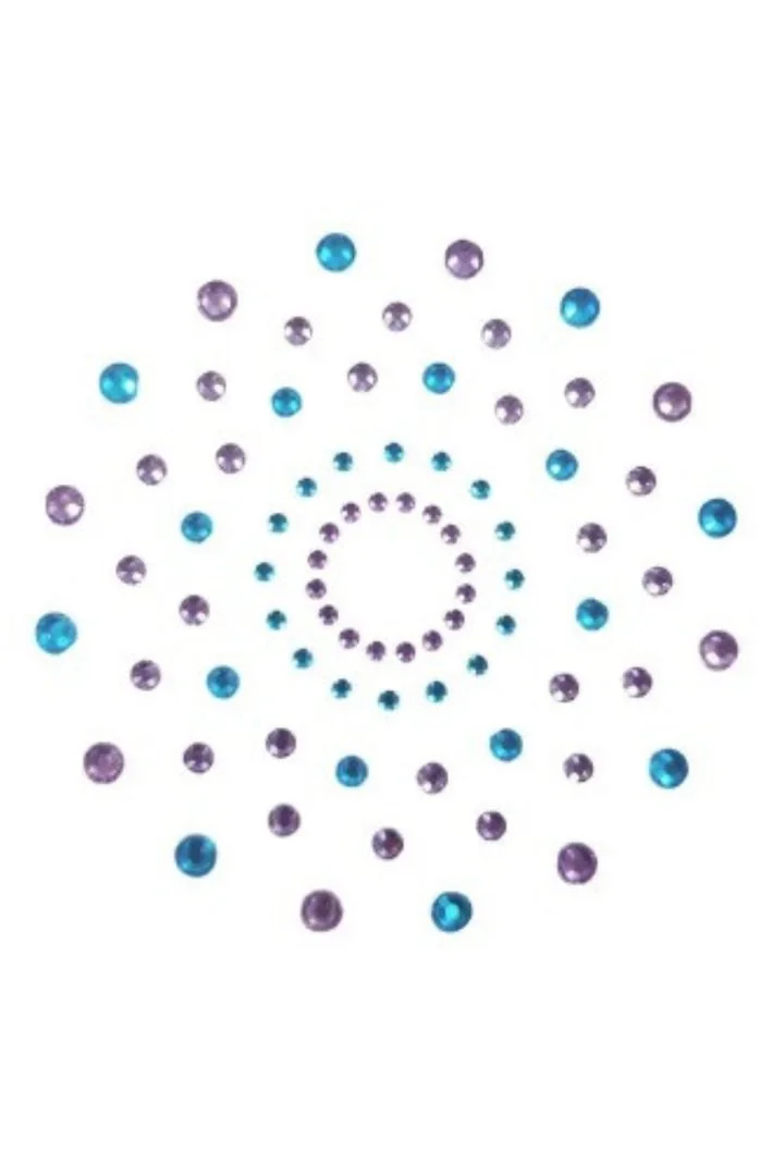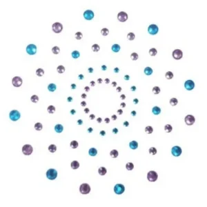 Sehr hübsche, selbstklebende und wiederverwendbare Brustwarzenabdeckungen, um Ihre Brust mit mehrfarbigen Strasssteinen in Blau und Violett zu verschönern. Brustwarzenabdeckungen, die selbstklebend und wiederverwendbar sind. Material: PETP (Polyethylenterephthalat) und Acryl.