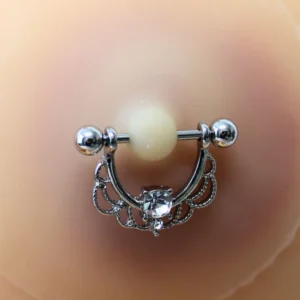 Paar Brustwarzenabdeckungen mit Halbkreis-Barbell-Piercing und Strasssteinen, für helle Haut. – XP008C
