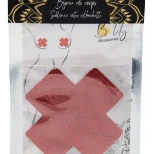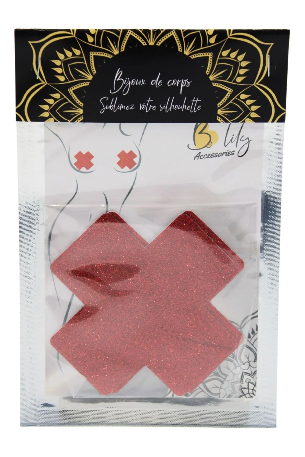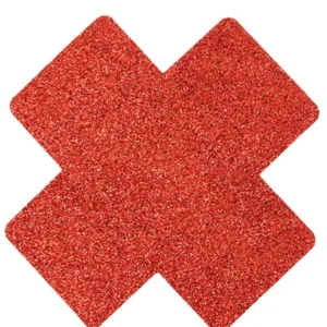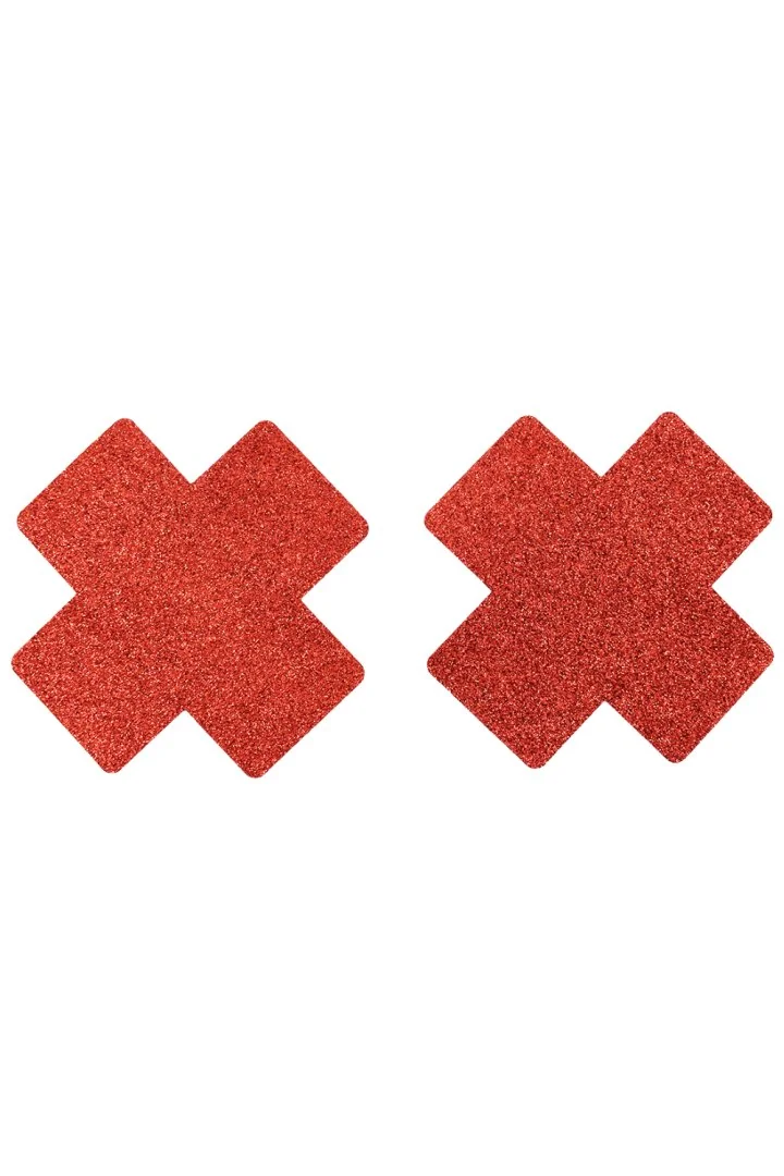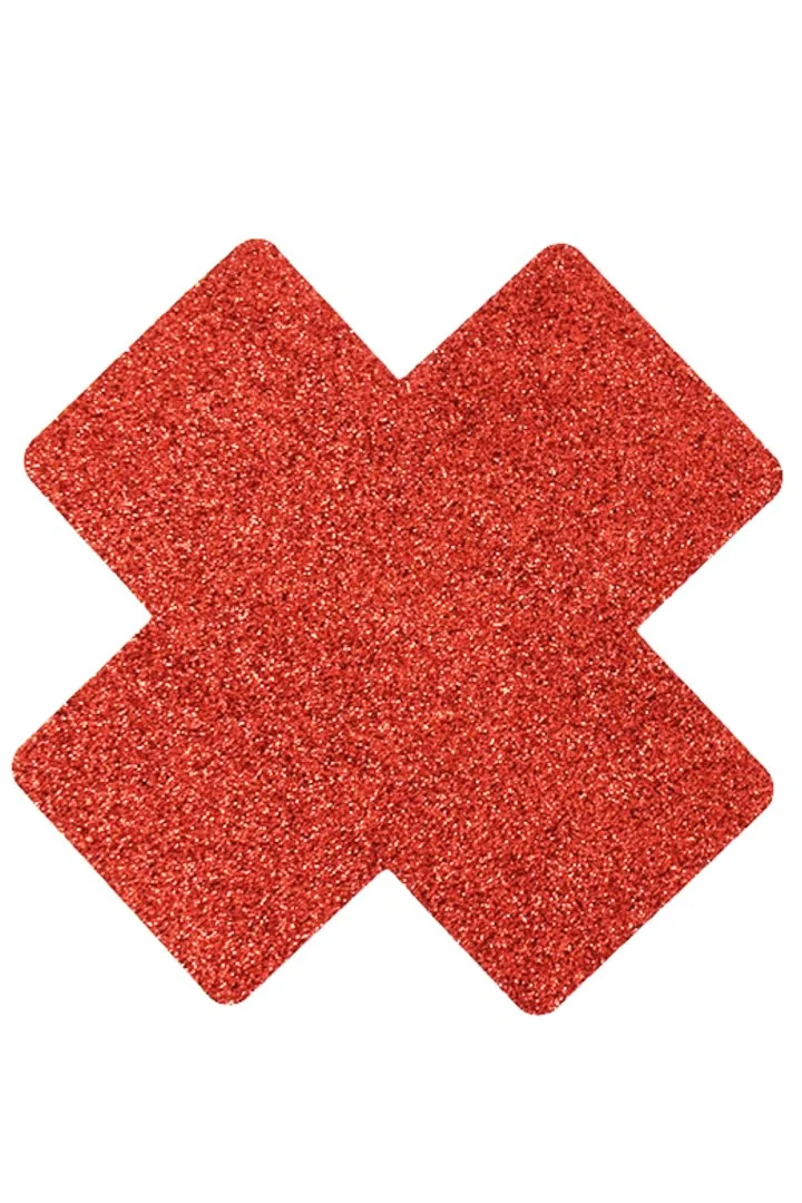 Kreuzförmige Brustwarzenabdeckungen für Brustwarzen. Rotes, glitzerndes Kreuz zum Aufkleben, um Ihre Brust zu verschönern. 80 % Papier – 15 % PETP (Polyethylenterephthalat) – 5 % Kleber