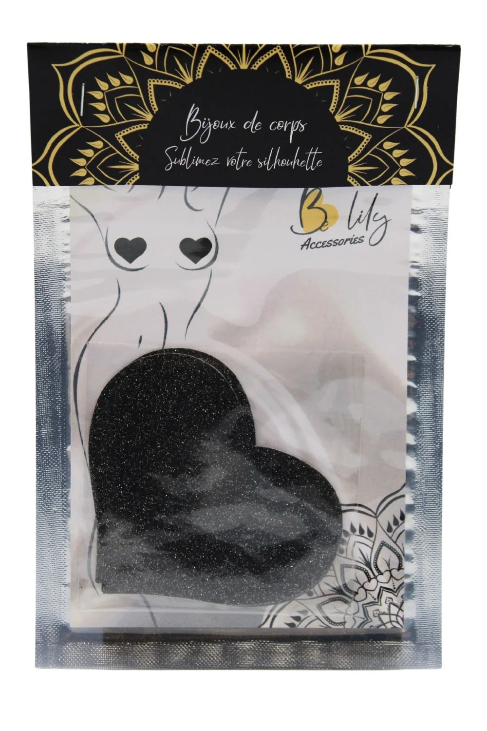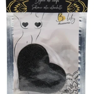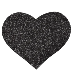 Herzförmige Brustwarzenabdeckungen. Schwarzes, glitzerndes Herz zum Aufkleben, um Ihre Brust zu verschönern. 80 % Papier – 15 % PETP (Polyethylenterephthalat) – 5 % Klebstoff