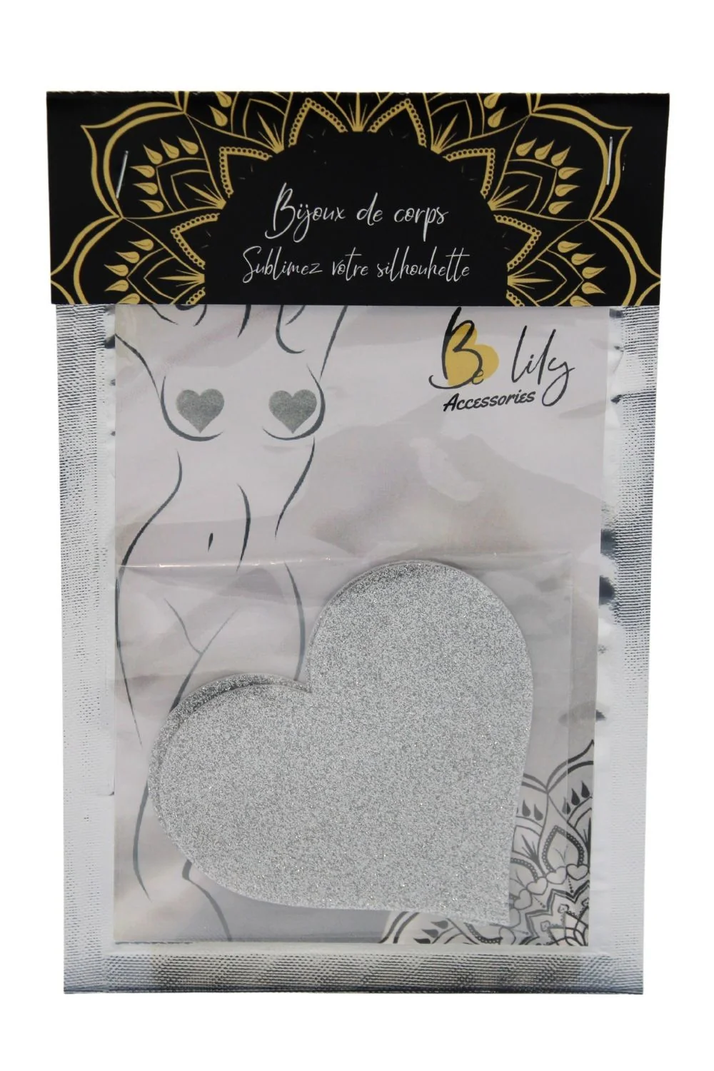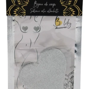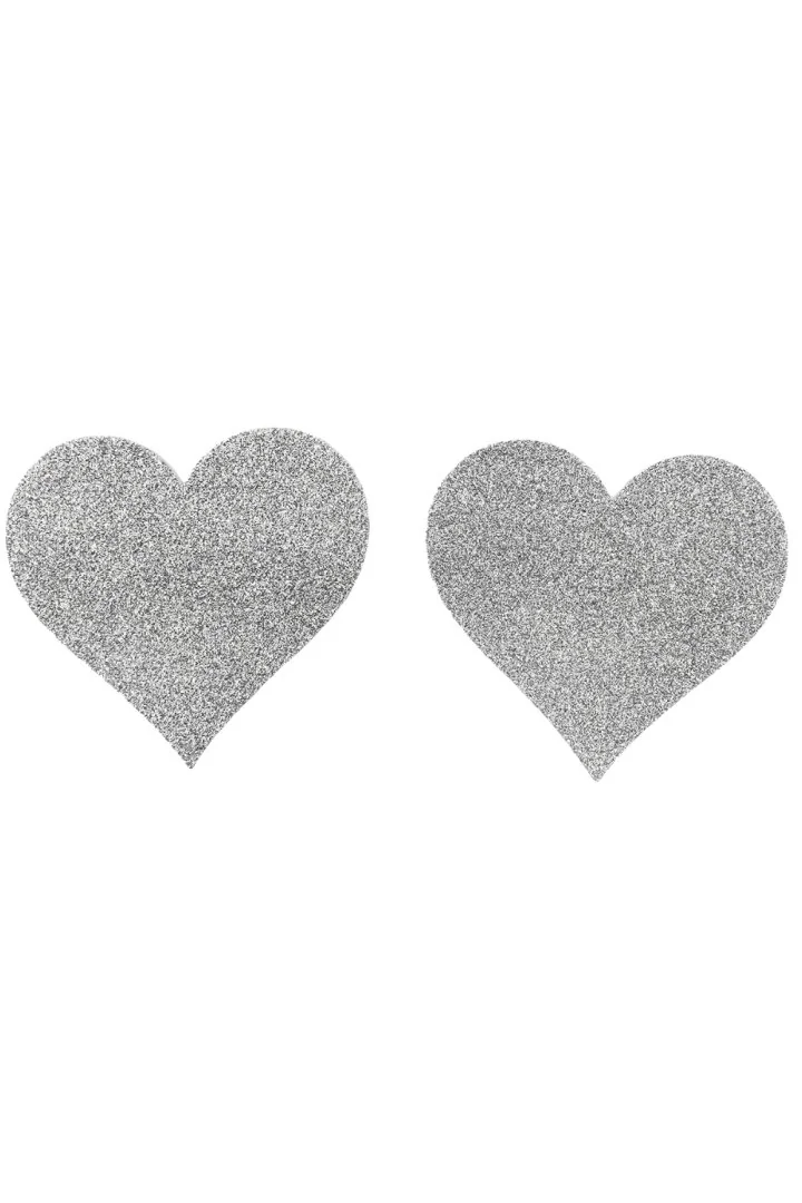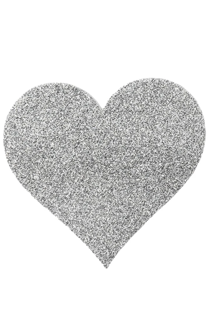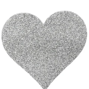 Herzförmige Brustwarzenabdeckungen. Weiß glitzerndes Herz zum Aufkleben, um Ihre Brust zu verschönern. 80 % Papier – 15 % PETP (Polyethylenterephthalat) – 5 % Kleber