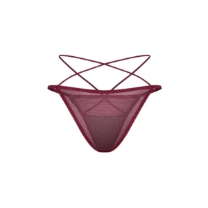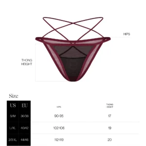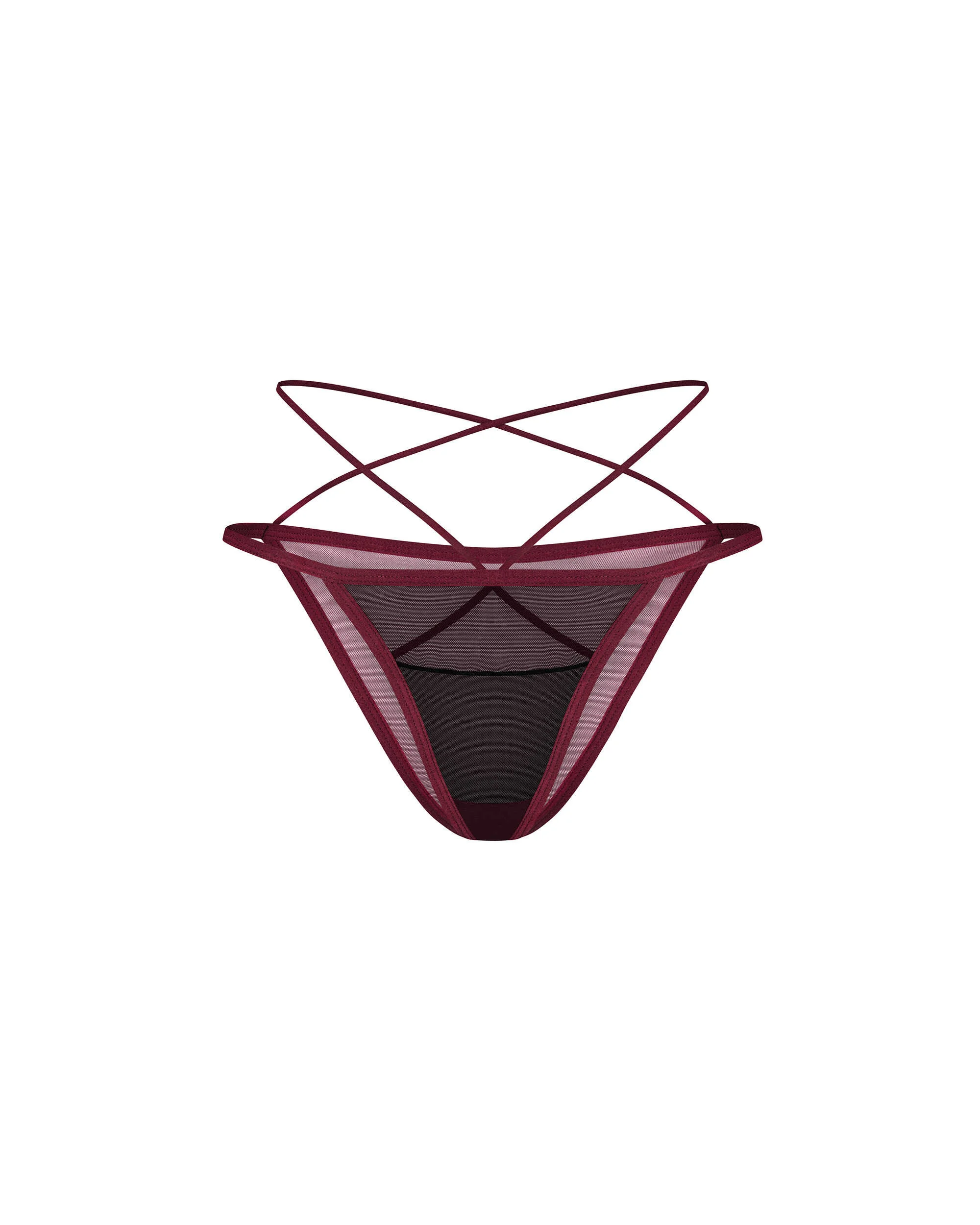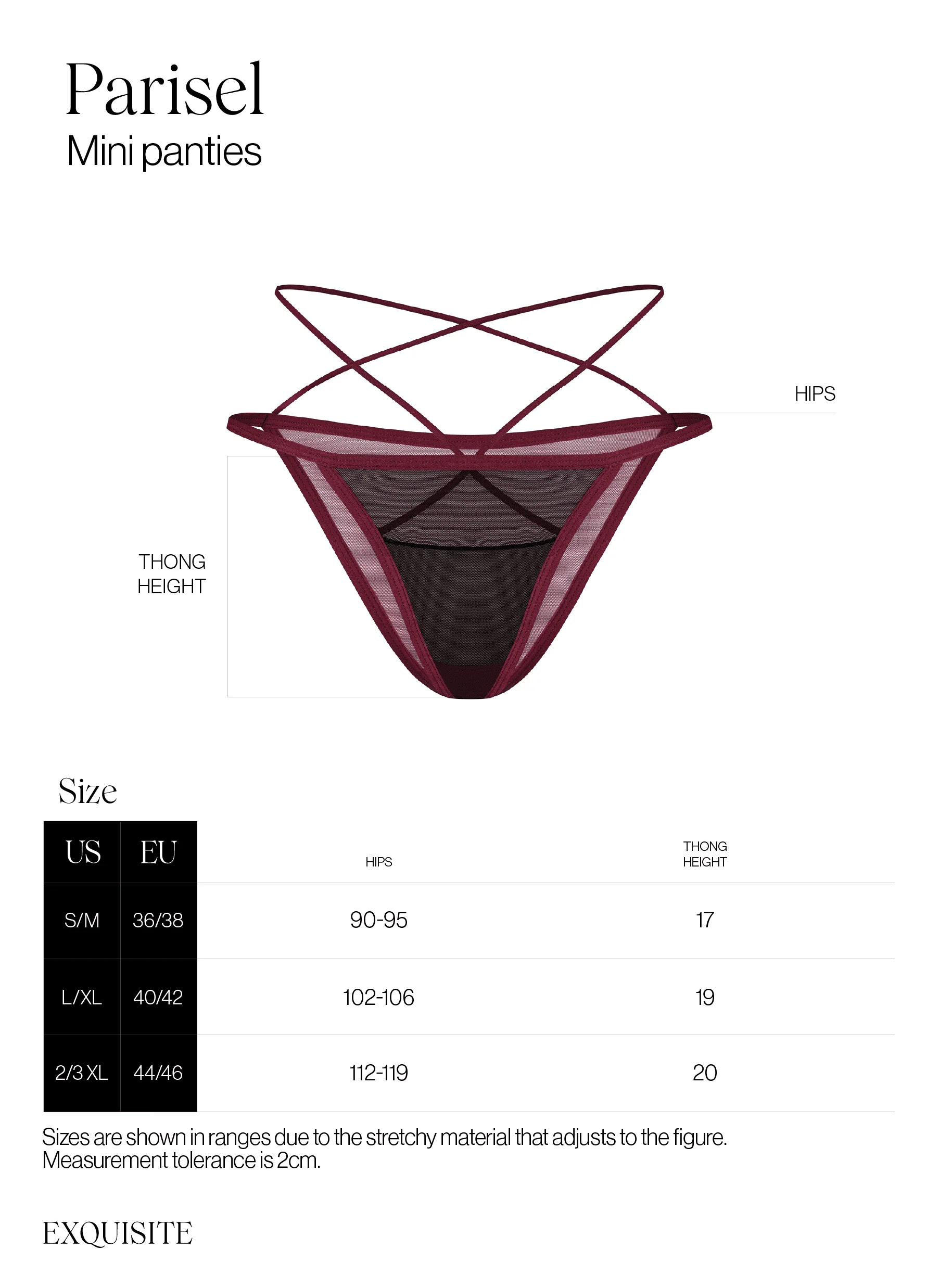Parisel Mini-Culotte Verwandeln Sie Ihr Lingerie-Spiel mit den Parisel Mini-Culottes in tiefem Bordeaux mit auffälligen schwarzen Akzenten und einer eleganten Verzierung entlang der Hüften, die Raffinesse ausstrahlt. Aus transparentem Netz gefertigt, verfügen sie über zarte Träger vorne und hinten, die ihrem weichen und luxuriösen Gefühl eine verführerische Note verleihen. – Bordeaux- und schwarze Culotte – elegante Details an der Hüfte – weiches und transparentes Netzgewebe – 94 % Polyamid, 6 % Elasthan – Entworfen in der EU – nickelfrei für empfindliche Haut