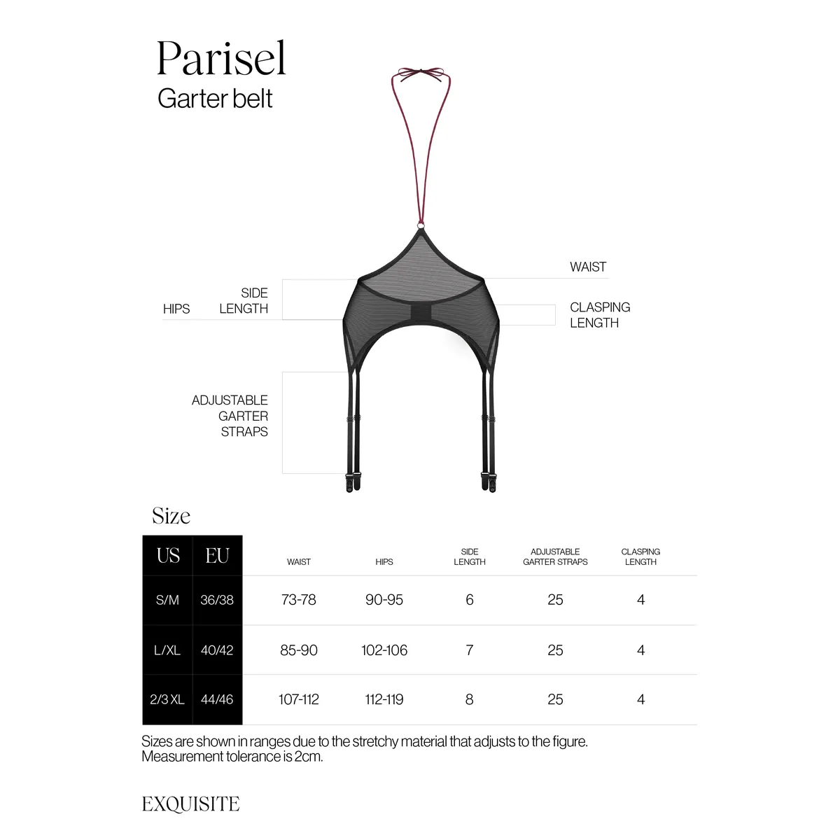 Parisel Strumpfband Diese Parisel Strumpfband verkörpert moderne Raffinesse mit ihrem transparenten Design und hochwertigen elastischen Stoffen. Der elegante schwarze Gürtel verfügt über verstellbare Träger und einen Mehrfachhakenverschluss auf der Rückseite, der eine perfekte Passform gewährleistet. Der Halsriemen verleiht zusätzliche Eleganz und verbessert Komfort und Stil. Schwarzes Strumpfband Hochwertiger transparenter Stoff Verstellbare Träger für eine individuelle Passform – Schulterriemen für mehr Eleganz 94 % Polyamid, 6 % Elasthan – Entworfen in der EU Nickelfrei für empfindliche Haut