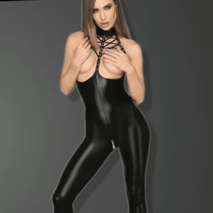Powerwetlook elastisch Kunstlederoptik Schnürung brustfrei Topteil Riemen Ösen silberne Zweiwegreißverschluss Schrittöffnung hauteng glänzend atmungsaktiv figurbetont sexy