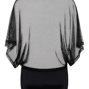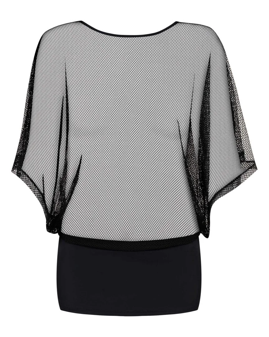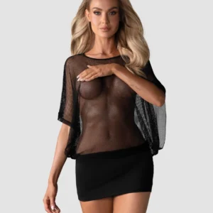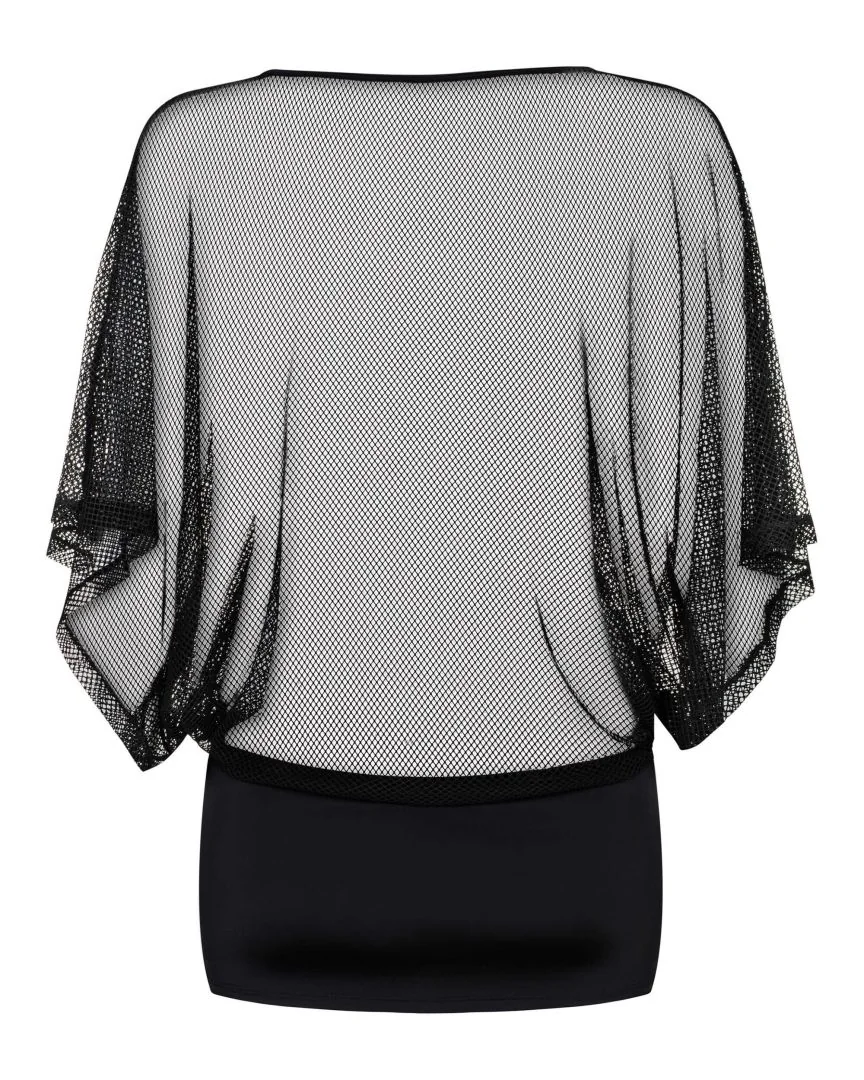 Mini-robe frivole, sexy ! Haut séduisant et mini-jupe. Faut transparent avec de larges manches. Mini-jupe faite de tissu agréable et flexible. De même matière que le haut.. String sexy inclus. Composition : 90 % de Polyamide, 10 % d’Élasthanne