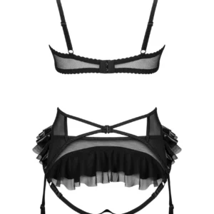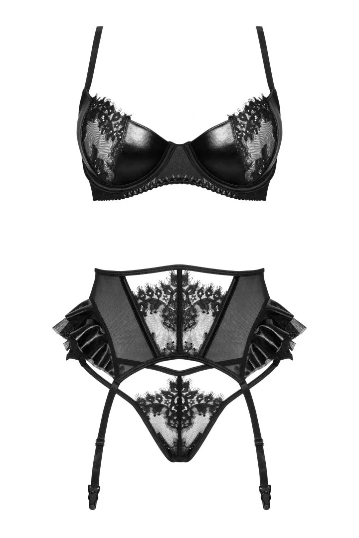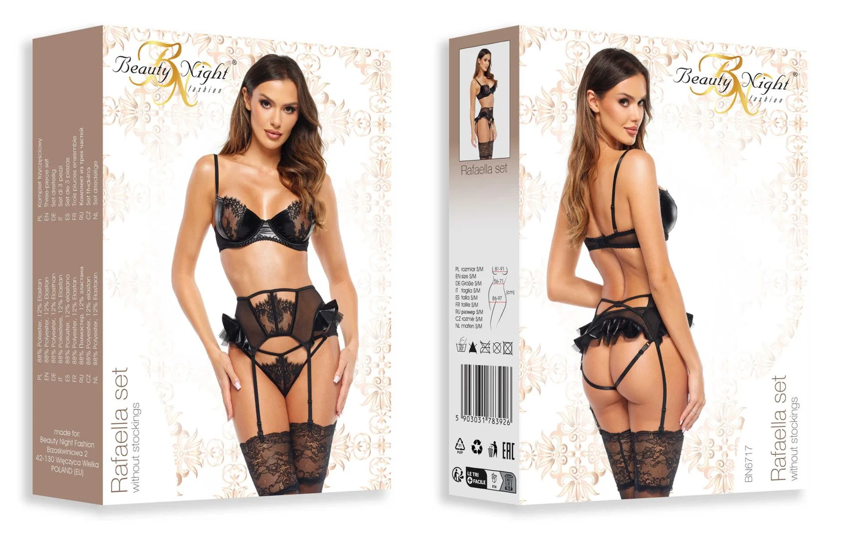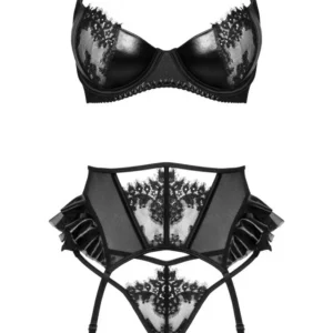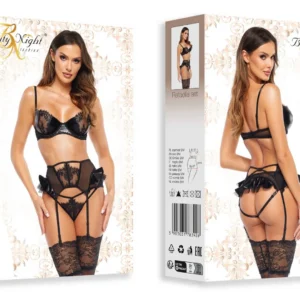 Cet ensemble de lingerie époustouflant allie élégance et style audacieux et sensuel. Fabriqué en dentelle noire, tulle et wetlook, il accentue parfaitement les courbes féminines, renforçant la confiance. Le soutien-gorge à armatures avec des bonnets en dentelle met magnifiquement en valeur la poitrine tout en assurant un confort. La ceinture haute à volants délicats met en valeur la taille, et les bretelles réglables permettent un ajustement parfait. L?ensemble est complété par des strings sensuels qui complètent harmonieusement le reste de l?ensemble. Matériel : Dentelle, tulle et wetlook soulignent un look sensuel et l?élégance. Motif floral en dentelle répété dans le soutien-gorge, la jarretière et la culotte. Soutien-gorge : Avec des bonnets en dentelle, offrant un soutien et rehaussant le buste. Jarretière : Avec des volants décoratifs, accentuant la taille et les armatures pour un ajustement parfait. Thongs : Sensuel et délicat, complétant parfaitement l?ensemble. Bretelles réglables : Dans le soutien-gorge et la jarretière, assurant un ajustement parfait pour toute silhouette. Design : Les volants espiègles à l?arrière ajoutent charme féminin et légèreté. Emballage : L?ensemble est livré dans une boîte élégante, ce qui le rend idéal pour les cadeaux.Cet ensemble de lingerie est le choix parfait pour les soirées romantiques et les occasions spéciales, mettant en valeur votre féminité et élégance.Messieurs, vous cherchez un cadeau qui impressionnera? L?ensemble Rafaella est le choix parfait. Taille : S/M et L/XLTaille S/M : (Poitrine : 81-91 cm, B-C, Taille : 56-71 cm, Hanche : 85-97 cm)Taille L/XL : (Poitrine : 91-107 cm, C-D, Taille : 71-91 cm, Hanche : 97-112 cm)Matière : 88 % polyester, 12 % élasthanne