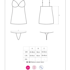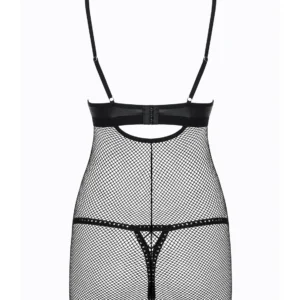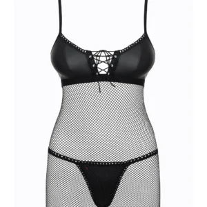 Belle et rebelle ? cette nuisette est faites pour vous !Subtil mélange d’un tissu effet „cuir“ et de maille filet, la nuisette dévoile votre peau tandis que le string assorti souligne votre chute de rein. A vous de jouer avec le laçage de la poitrine pour stimuler son imagination….Filet multistrech parfaitement élastiqueTissu effet „cuir“Bretelles et fermeture règlables ajustement parfaitLaçage sexy et ajustable sur le devantLivré avec le string assortiTissus douxComposition : 90% polyamide, 10% élasthanne
