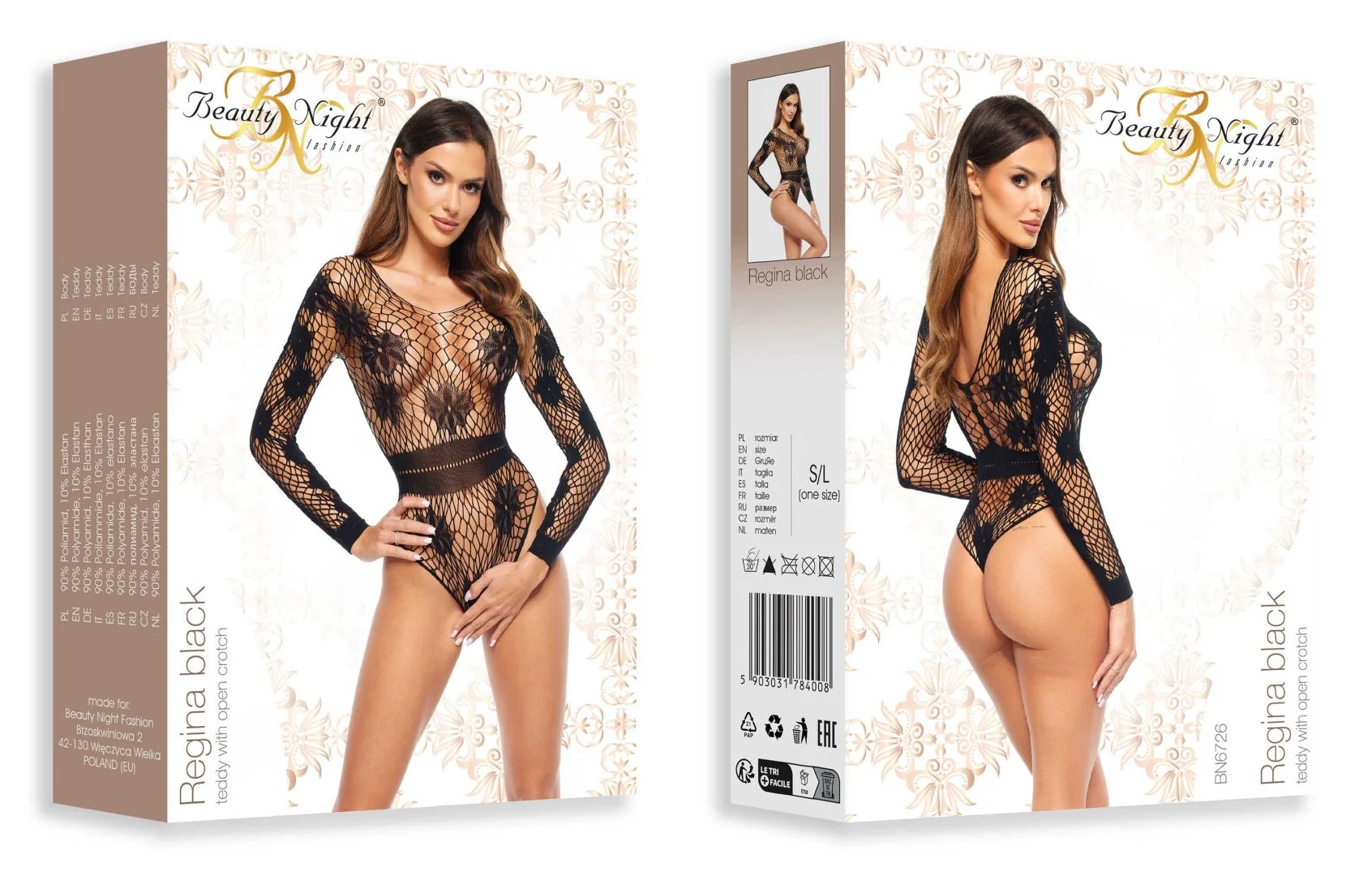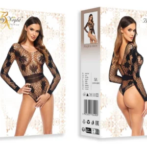 Body sexy de couleur noire pour les amateurs de sous-vêtements confortables et provocants. Le motif résille à grands ?illets est complété par des fleurs éparses et une ceinture à la taille. Le body peut être porté des deux côtés, selon vos préférences – avec une bretelle entre la poitrine ou dans le dos. Manches longues avec volants plus épais. Une ouverture pratique à l’entrejambe. Présenté dans un emballage élégant avec la photo présentant le produit. Taille: S/L Matériel: 90% Poliamide, 10% Élasthanne