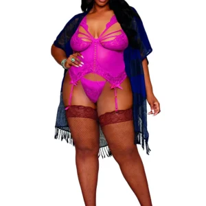 Rosa Strapshemd in großen Größen aus Netzstoff und floraler Spitze, verstellbare Strumpfhalter, passender String. Strümpfe nicht enthalten. Zusammensetzung: Strapshemd/String: Netz/Spitze: 90% Nylon, 10% Spandex; Ausschließlich Dekoration. Pflegehinweis: Handwäsche in kaltem Wasser, kein Bleichmittel, nicht im Trockner trocknen.