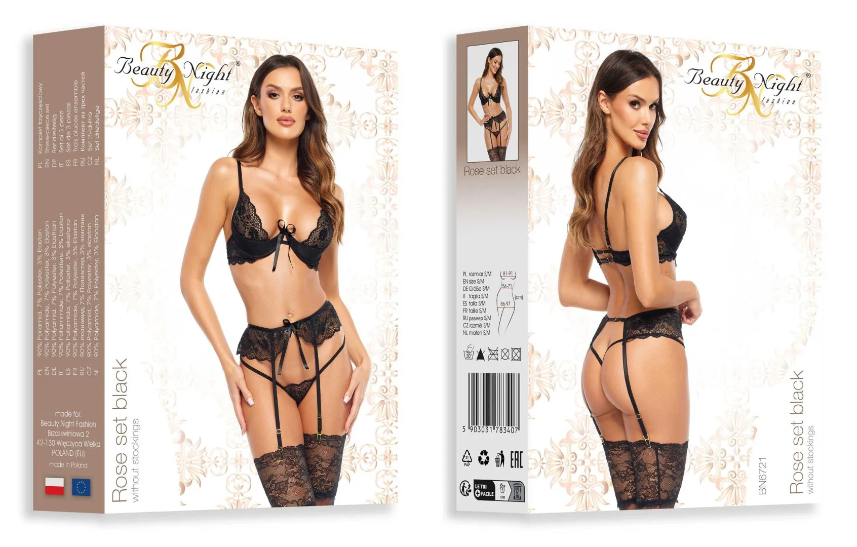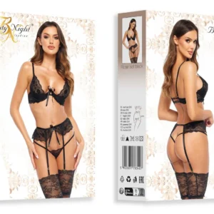 Un ensemble de lingerie classique en noir, composé d?un soutien-gorge, d?une culotte et d?un porte-jarretelles. Le soutien-gorge a un léger rembourrage dans les bonnets et des ajustements à la fois dans les bretelles et dans le dos.Le porte-jarretelles et le soutien-gorge sont surmontés d?un n?ud délicat. L?ensemble comprend une culotte string qui est disposée de manière créative sur les fesses. Un motif floral sur la dentelle relie tous les éléments de l?ensemble.L?ensemble est livré dans un emballage élégant avec une photo représentant le produit.Taille : S/M et L/XLTaille S/M : (Seins : 81-91 cm, B-C, Taille : 56-71 cm, Hanche : 85-97 cm)Taille L/XL : (Seins : 91-107 cm, C-D, Taille : 71-91 cm, Hanche : 97-112 cm)Matière : 90 % polyamide, 7 % polyester, 3 % élasthanne