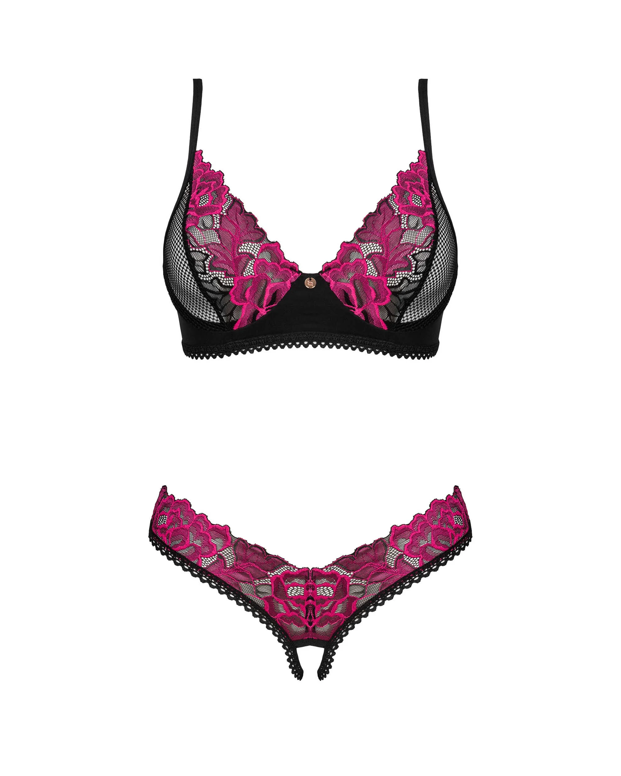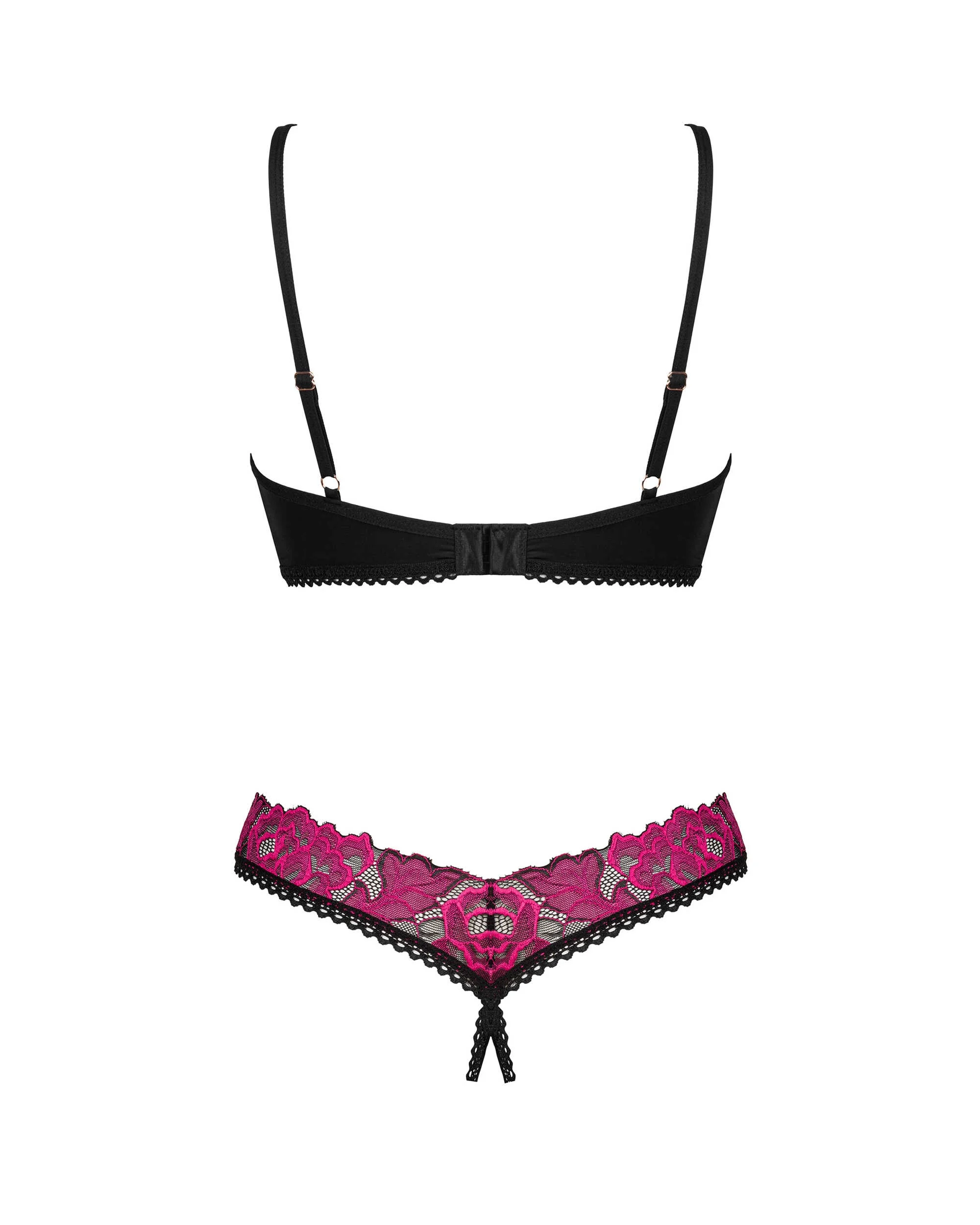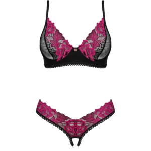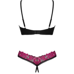 Ensemble 2 pièces ouvert RosentyDécouvrez votre côté prédateur avec ce superbe ensemble de lingerie Rosenty. La coupe sexy mettra vos charmes en lumière, et le string à l’entrejambe séduisant enflammera vos sens. Il suffit de regarder la broderie rose qui évoque les moments romantiques. Jugez-en par vous-même ! Découvrez plus de détails :- string avec entrejambe ouvert et soutien-gorge – design intriguant- fermeture à plusieurs niveaux et bretelles réglables – la garantie d’un ajustement parfait- armatures soulignant la poitrine- motif floral – attire l’attention- un détail intéressant sous la forme d’un pendentif brillant- tissu alliant douceur et souplesseComposition : 90 % polyamide, 10 % élasthanne