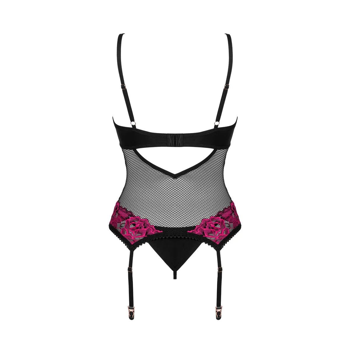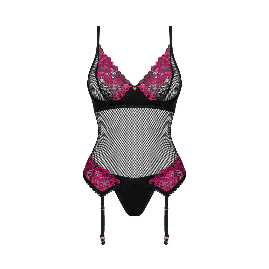 Rosenty KorsettKümmern Sie sich um Ihren Komfort und verzichten Sie niemals auf einen verführerischen Look. Das Rosenty Korsett wird Ihren Körper in ein transparentes Netz mit köstlicher Pflege hüllen und Ihre Silhouette mit einem Blumenmuster betonen. Denken Sie an den Eindruck von Schönheit, den Sie hinterlassen, wenn Sie diesen Look mit Ihren Lieblingsstrümpfen vervollständigen.Entdecken Sie mehr Details:- schwarzes Korsett und String- perfekte Passform dank verstellbarer Träger und Strumpfhalter sowie mehrstufigem Verschluss- Bügel, die die Brust betonen- faszinierende Kombination aus Blumenmuster und Netz- dezenter Anhänger – ein elegantes Accessoire- elastischer Stoff – schmiegt sich perfekt an den KörperZusammensetzung: 85 % Polyamid, 15 % Elasthan